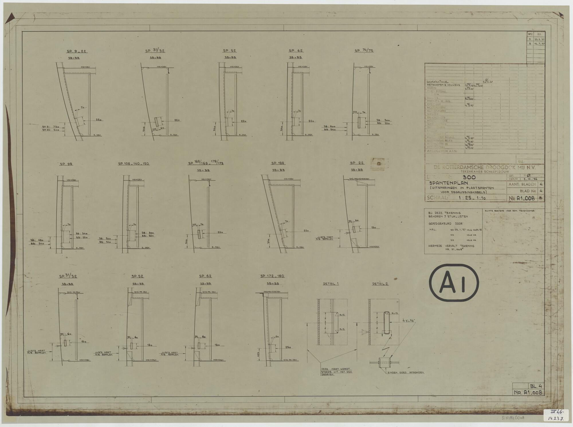 Het passagiersschip ss. 'Rotterdam' van de NASM (HAL), 1968. Uitsparingen in plaatspanten voor de degausingkabels.