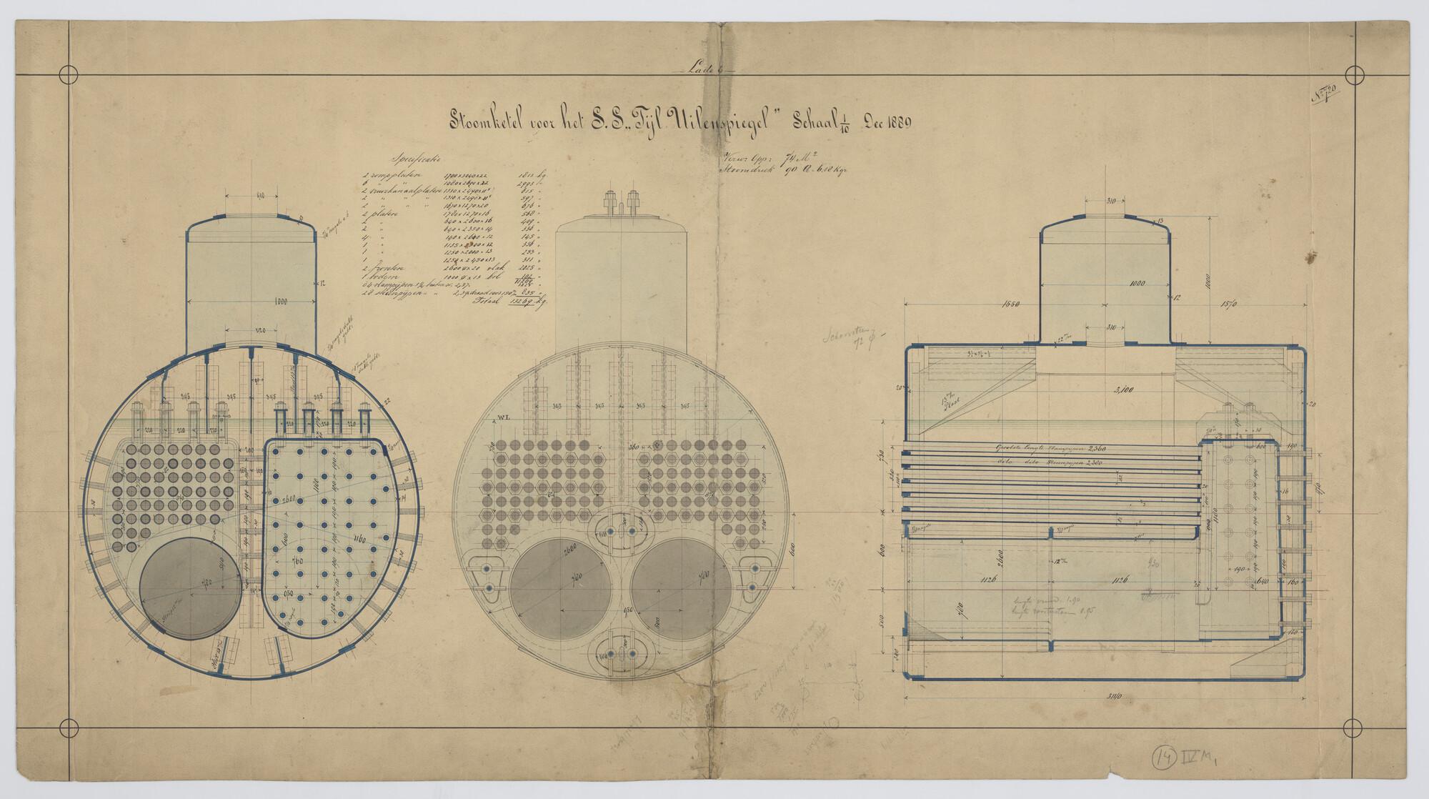 Verticale langsdoorsnede en bovenaanzicht van de sleepboot "Tijl Uilenspiegel" 1889, afmetingen 24 x 5.52 x 2.50 meter. Schotse ketel.