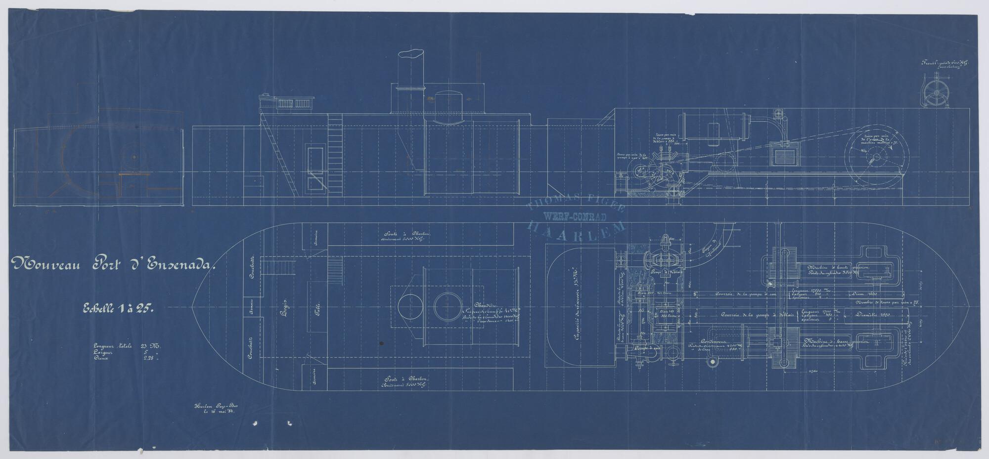 Horizontale langsdoorsnede, verticale langsdoorsnede en dwarsdoorsnede Slikzuiger, 1884. Afmetingen 23 x 5 x 2.28 meter.