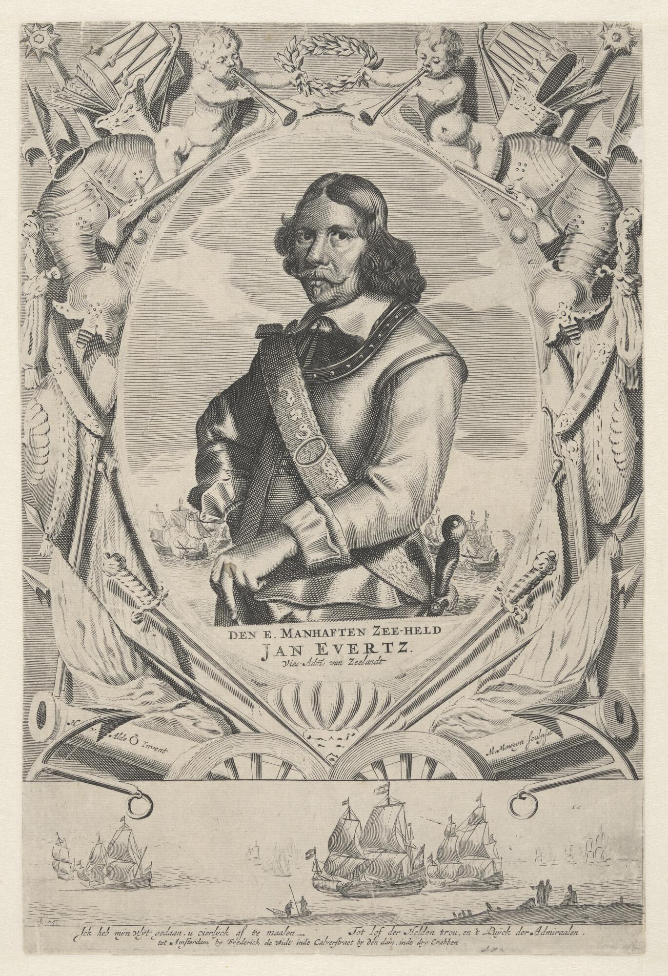 Portret van Jan Everten, vice-admiraal van Zeeland, in een cartouche van wapentrofeeën; eronder: schepen op zee door Reinier Nooms alias Zeeman.