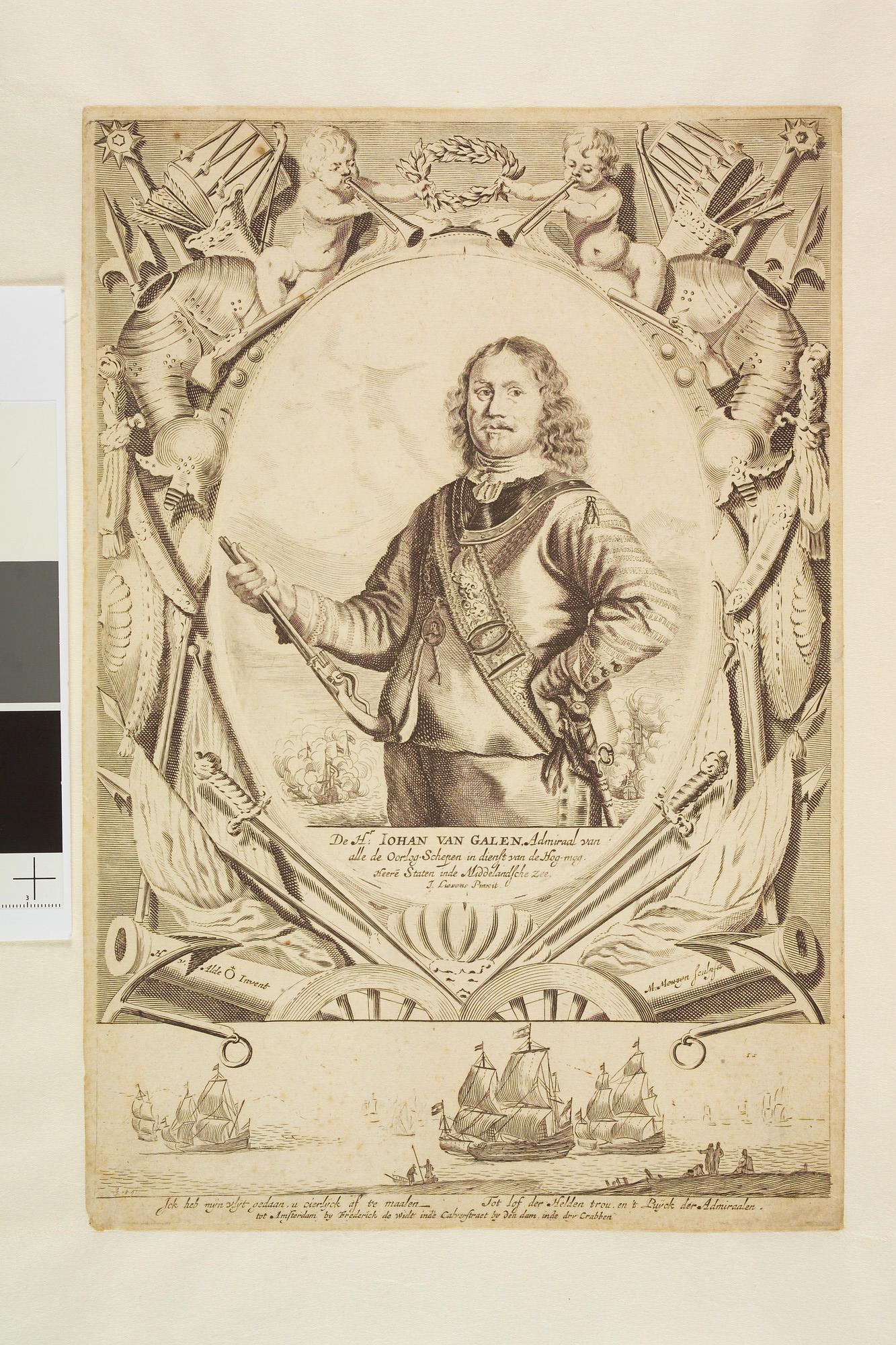 Portret van Jan van Galen, admiraal van Holland en Zeeland; eronder een kust met schepen door Reinier Nooms alias Zeeman.
