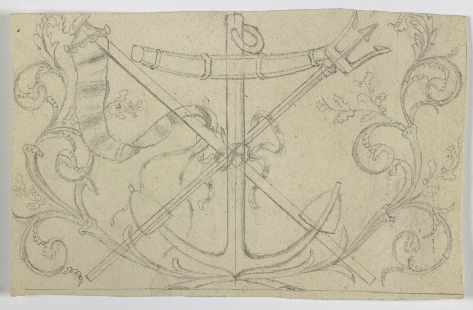 Tekening van spiegelversiering met anker, mercuriusstaf.