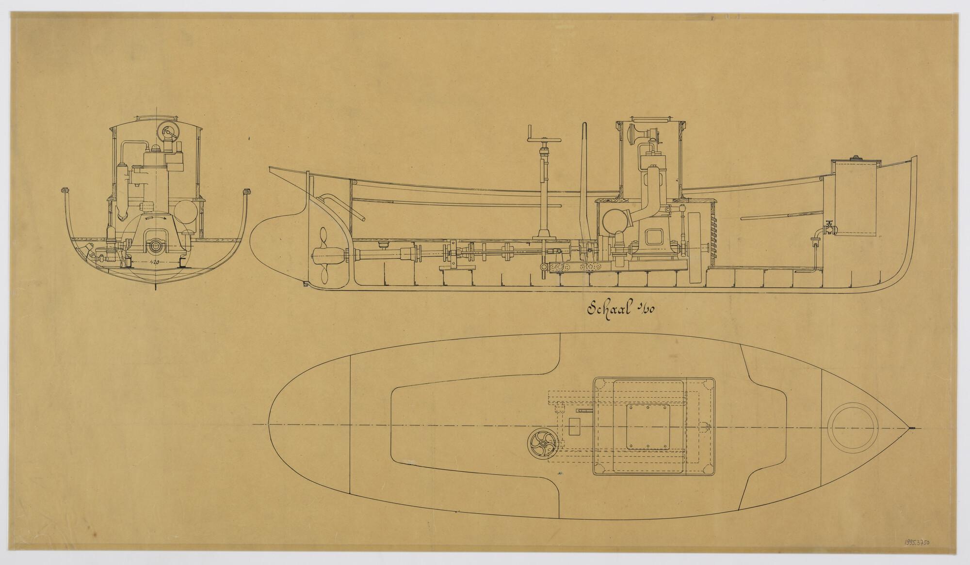 Algemeen plan met plaatsing motor en schroefas van motorsloep 'Sofia'
