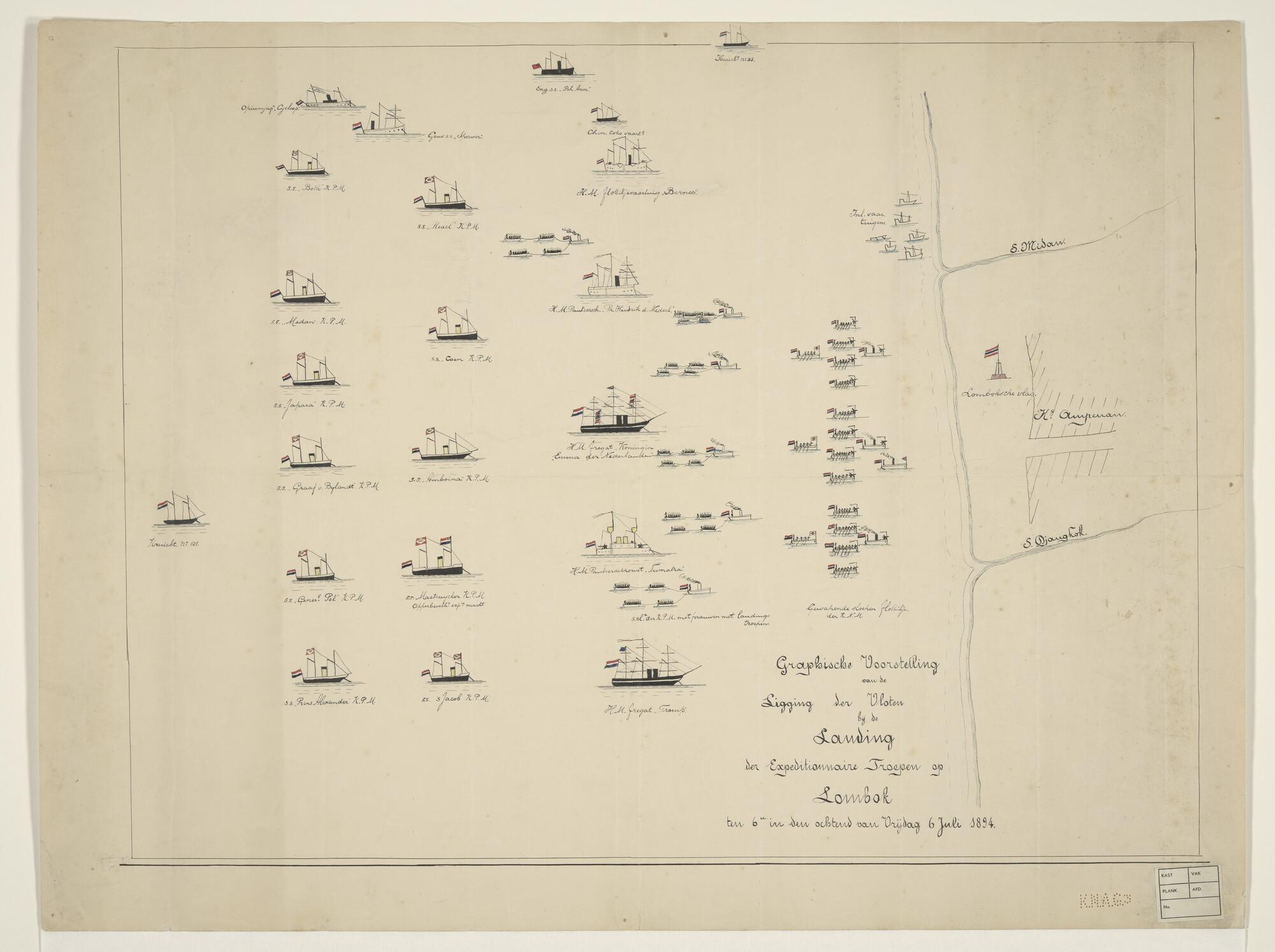 Voorstelling van de ligging van de vloten bij de landing van de expeditie van de troepen op Lombok op 6 juli 1894.
