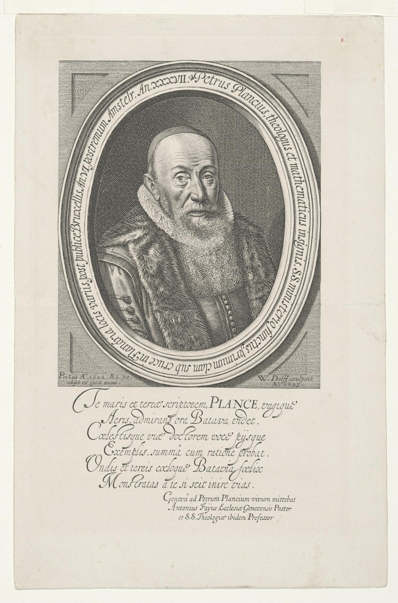 Portret van Petrus Plancius, een groot aardrijkskundige en zeevaartkundige en Hervormd Predikant, bortsbeeld naar rechts in ovaal met Latijns randschrift en onderschrift.