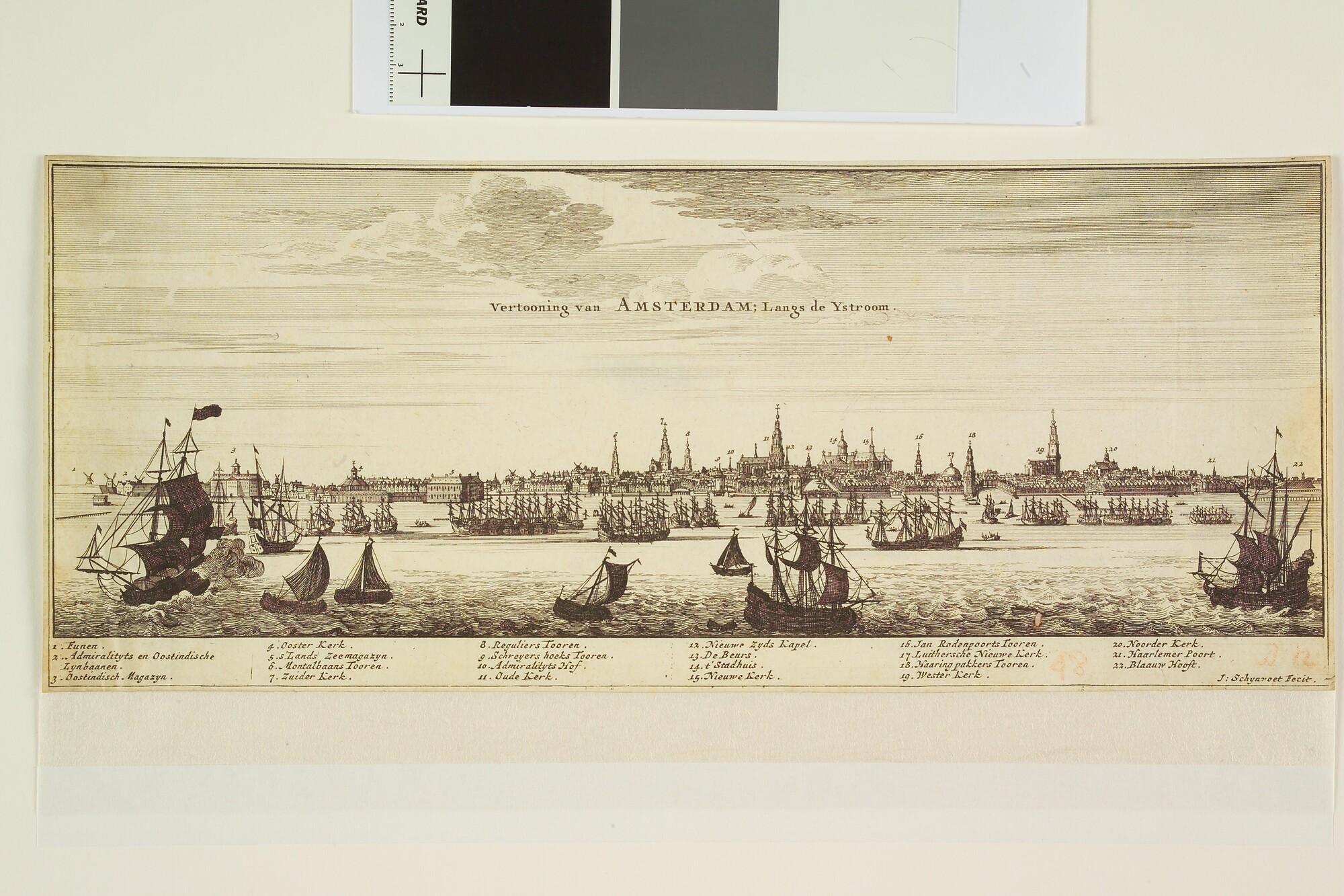 'Vertooning van Amsterdam; Langs de Ystroom.' Panorama van Amsterdam vanaf het IJ.
