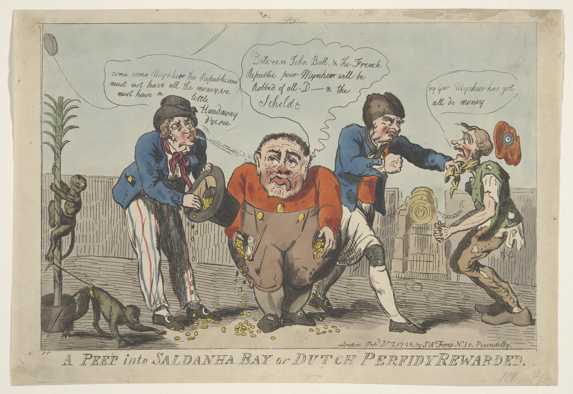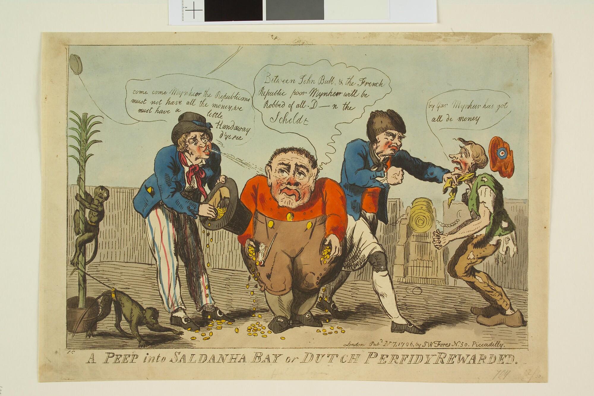 Engelse Spotprent op de onbetrouwbaarheid van de Nederlanders, naar aanleiding van de gebeurtenissen in de Baai van Saldanha, Zuid-Afrika, 1796.