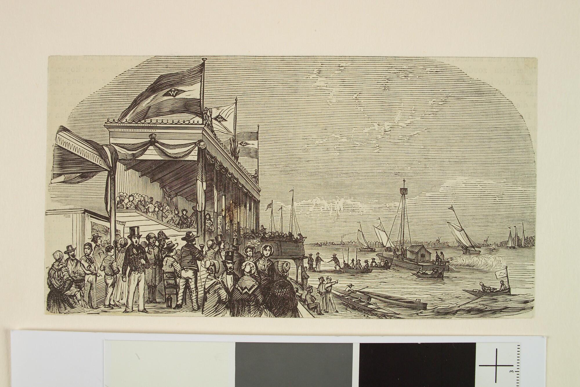 Zeilwedstrijd van de Koninklijke Nederlandsche Zeil- en Roeivereeniging op het IJ te Amsterdam, 21 augustus 1852. Rechts de tribune op de Oosterdoksdijk.