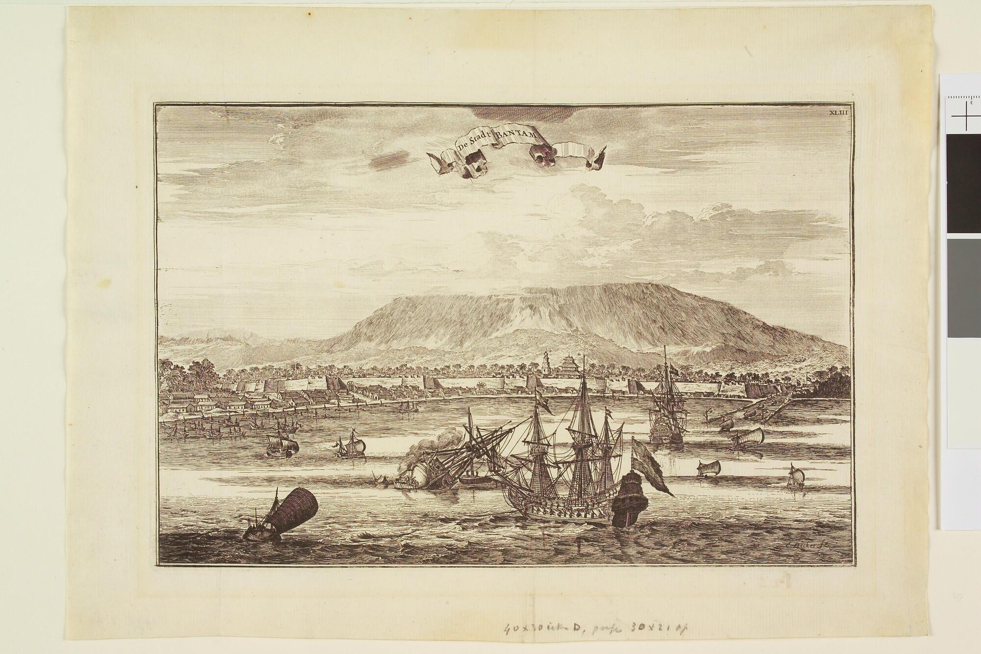 Gezicht op de rede van Bantam met Nederlandse oostindiëvaarders en inlandse scheepjes.