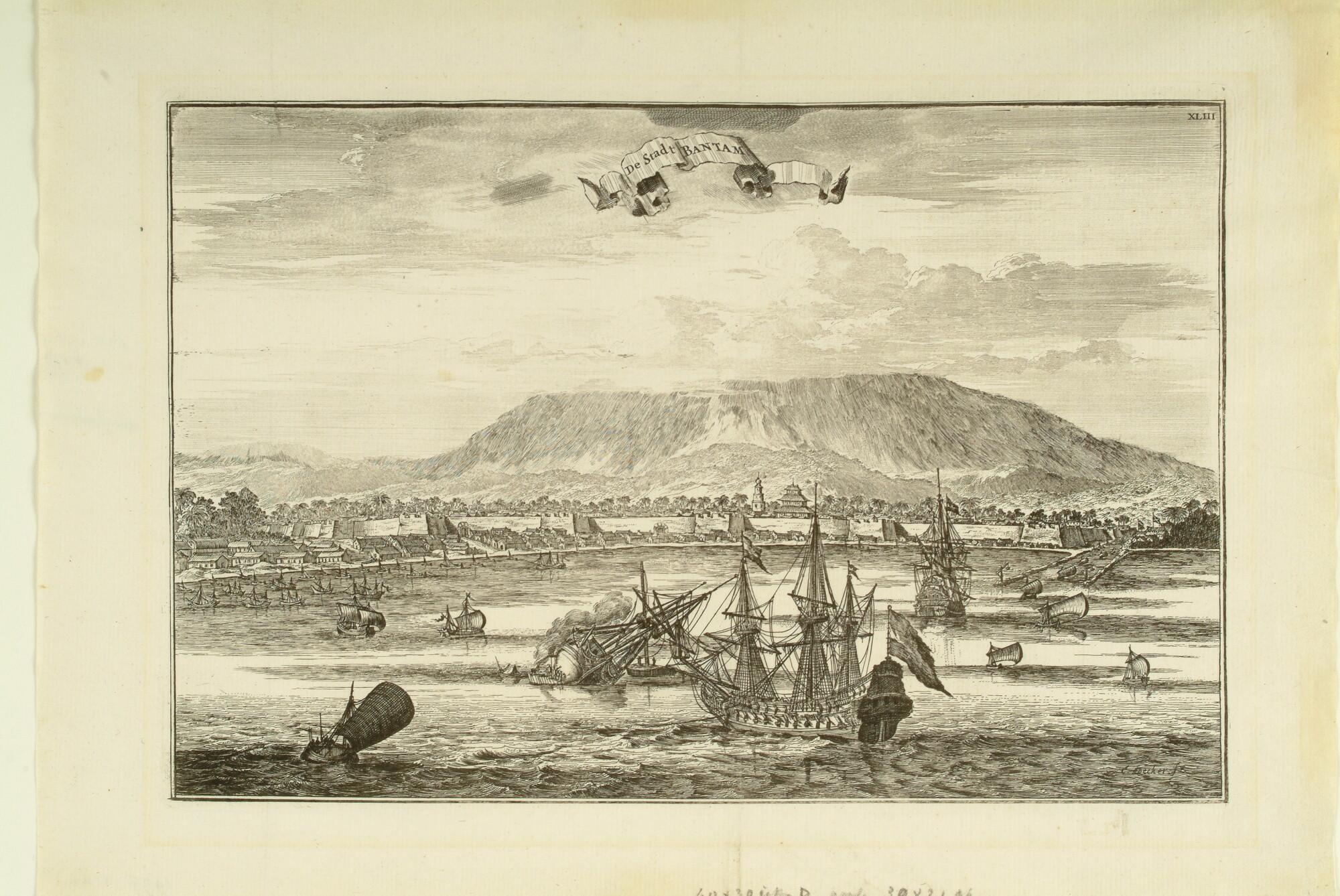 Gezicht op de rede van Bantam met Nederlandse oostindiëvaarders en inlandse scheepjes