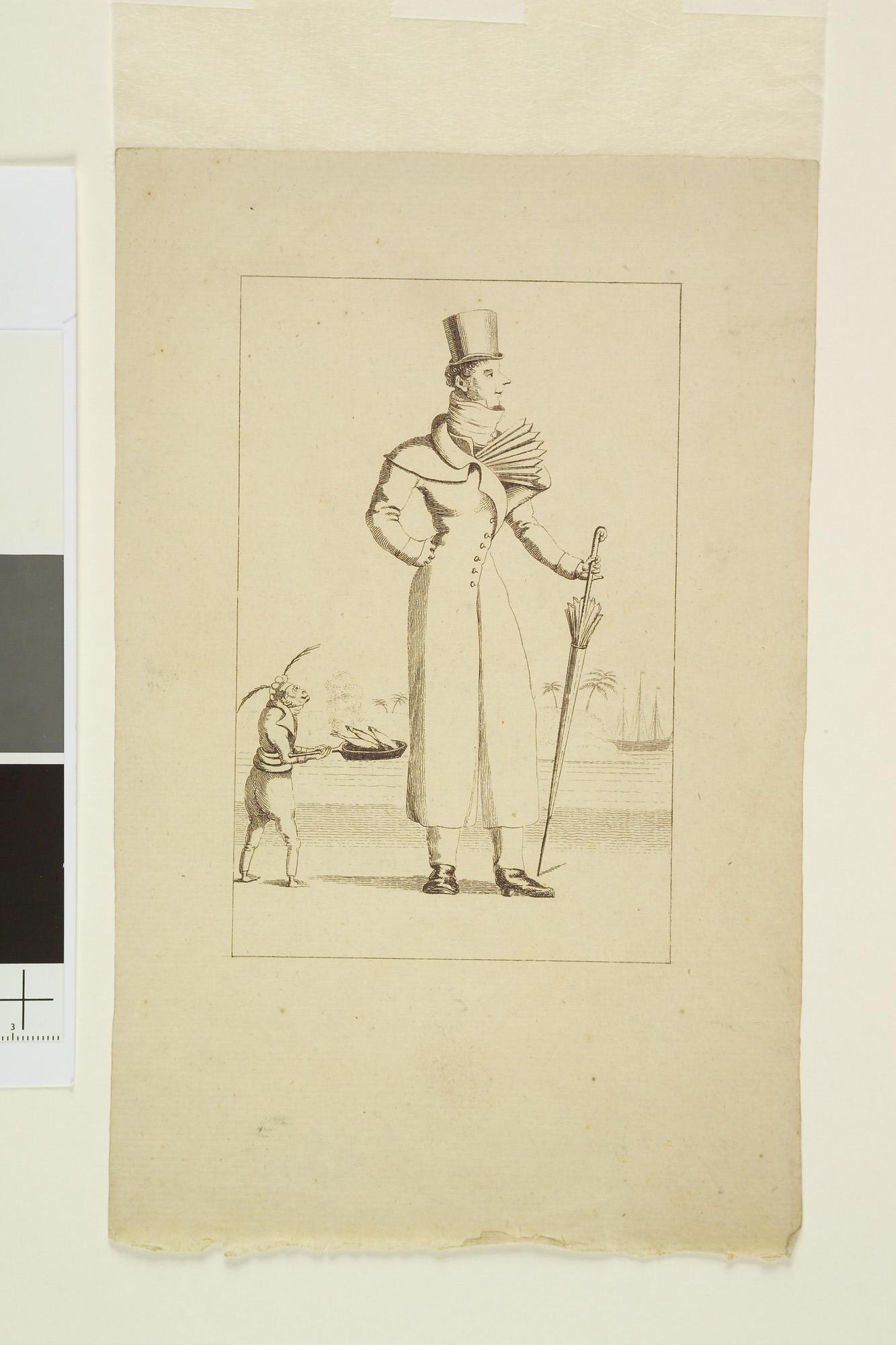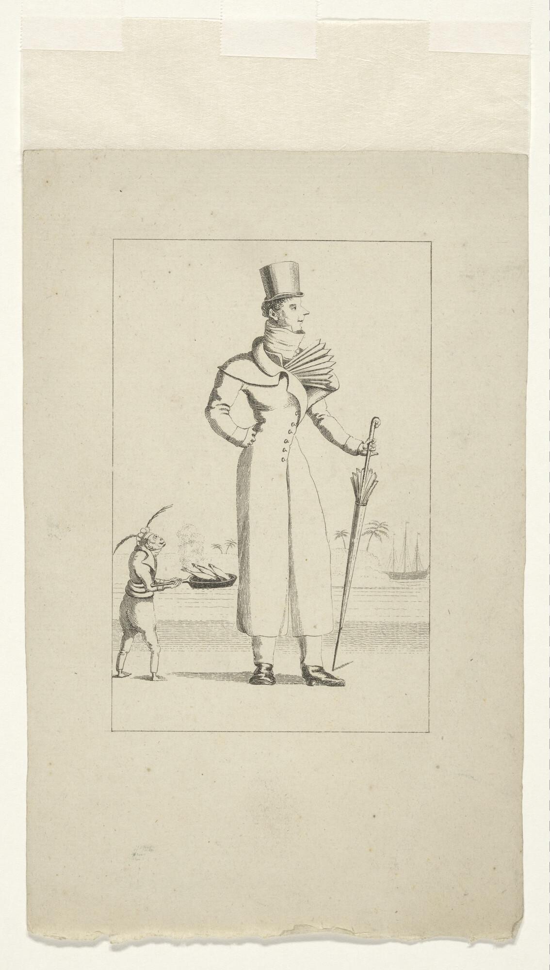 Europese heer in lange jas en hoge hoed, met waaier en parasol, in de tropen; links een aapachtig figuurtje dat hem een koekenpan met vis aanbiedt, rechts op de achtergrond een driemaster