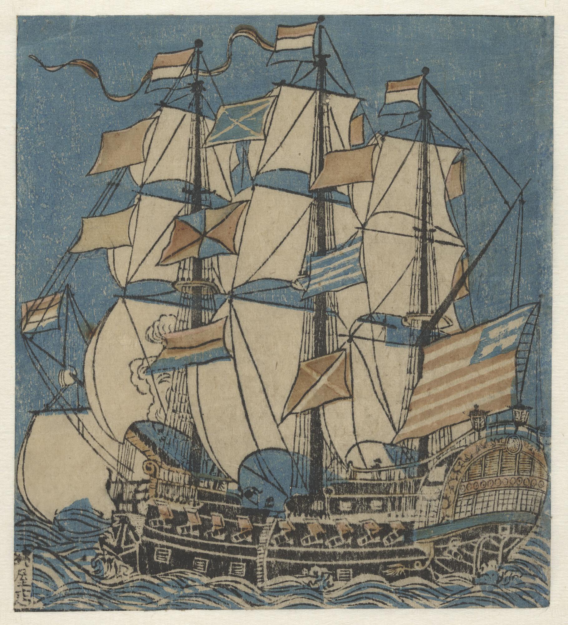 Nagasaki-prent: Driemaster met aan de masten de Nederlandse vlag en aan de stok de Amerikaanse vlag