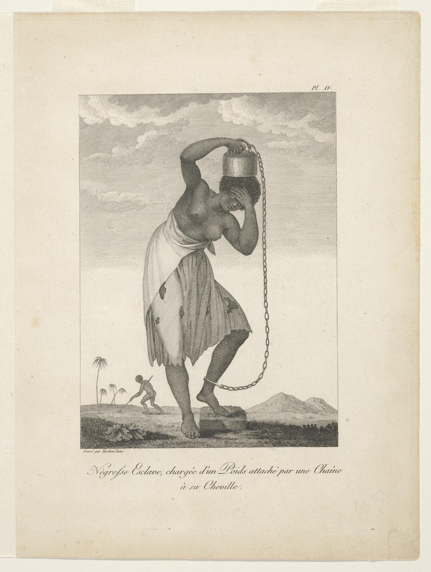 Gravure (plaat IV) uit de Franse editie van J.G. Stedman's 'Reize naar Surinamen' (1799 - 1800): tot slaaf gemaakte zwarte vrouw met een gewicht aan een ketting, bevestigd aan haar enkel.