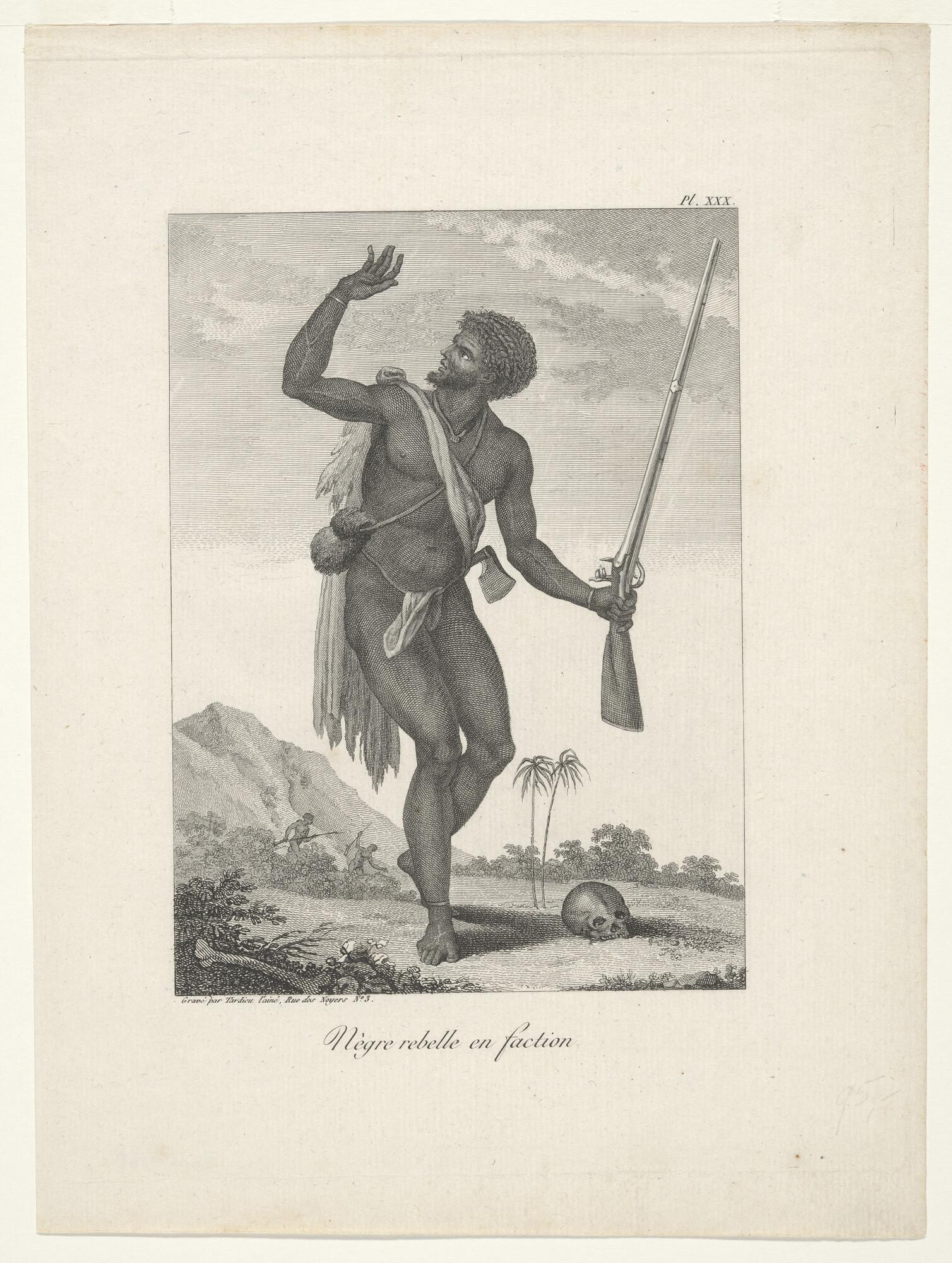 Gravure (plaat XXX) uit de Franse editie van J.G. Stedman's 'Reize naar Surinamen' (1799 - 1800): opstandige marron, bewapend met geweer en bijl.