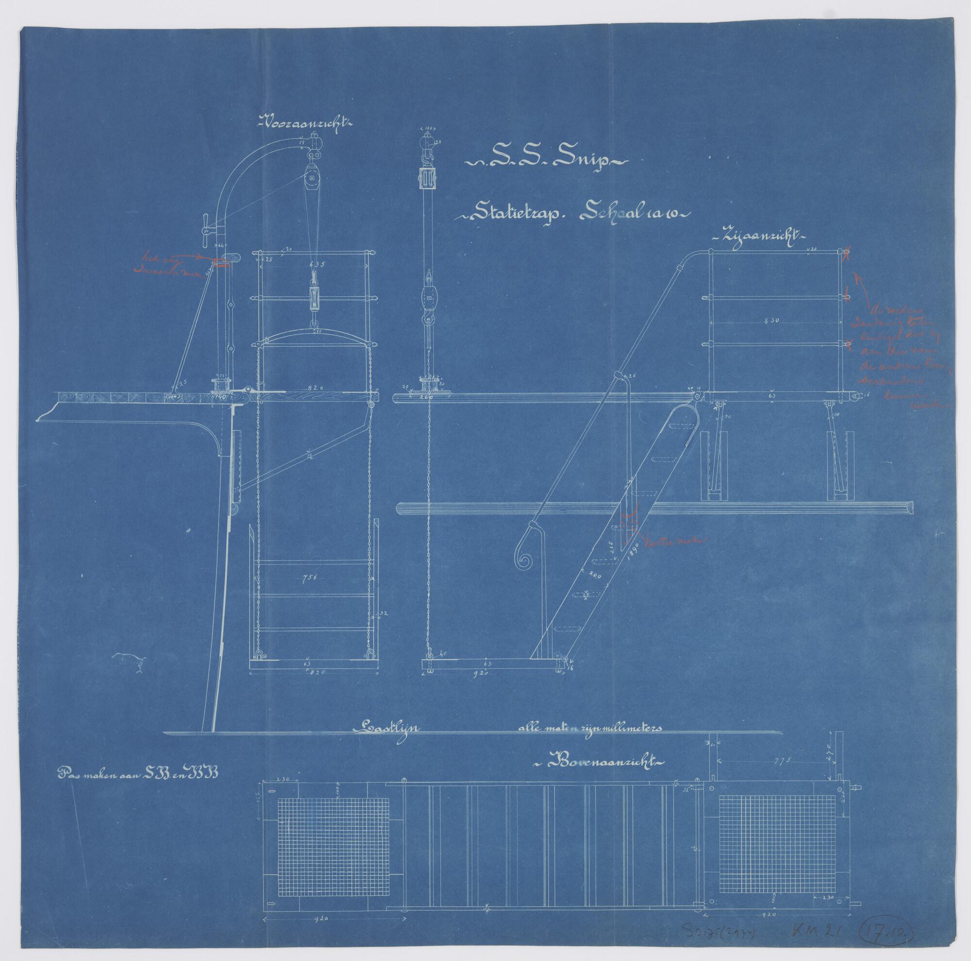 Bovenaanzicht, vooraanzicht en zijaanzicht van de statietrap met davit