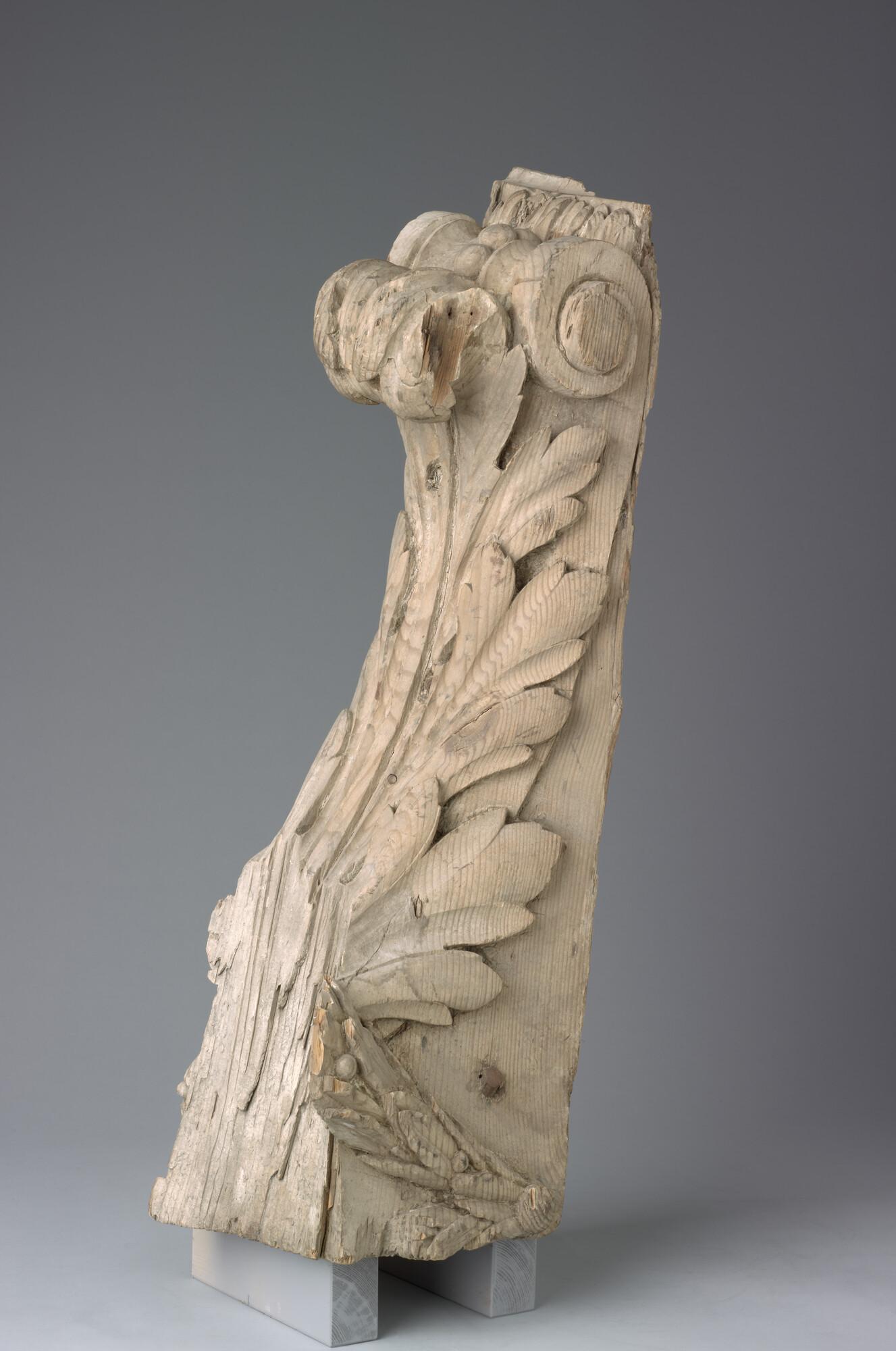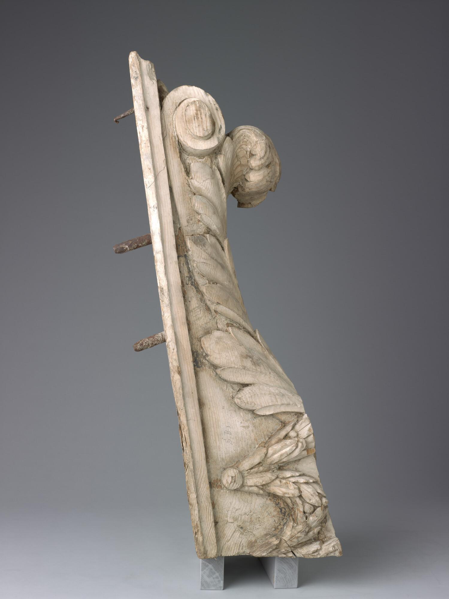 Spiegelversiering in de vorm van een console. Het snijwerk stelt een acanthusblad voor, uitlopend in een krul. Daarboven een motief in de vorm van een ankerspil met in het midden 4 bollen die de ketting weergeven. Aan de onderkant steken drie grote nagels uit.