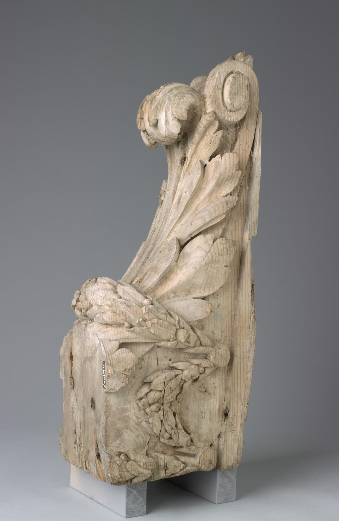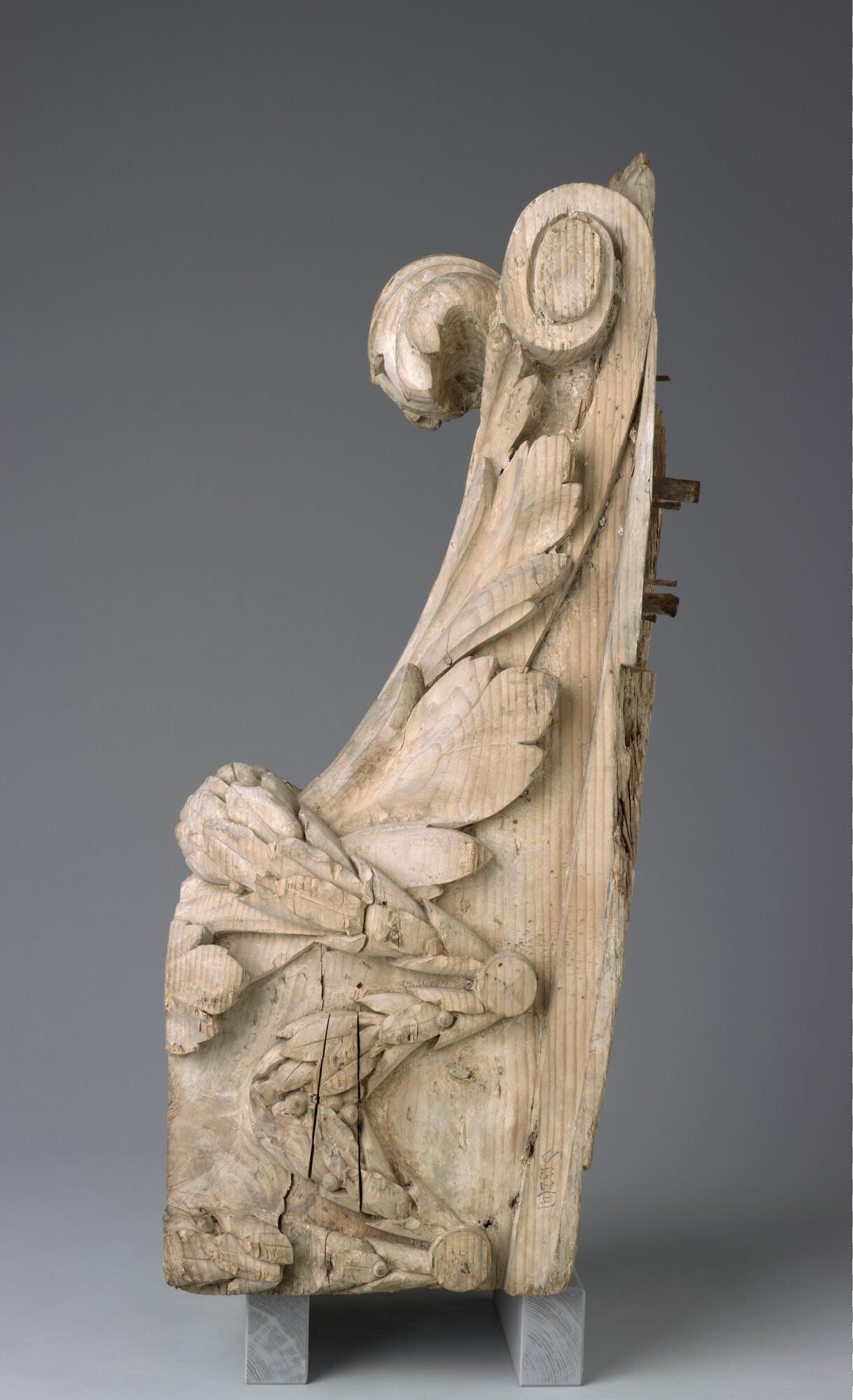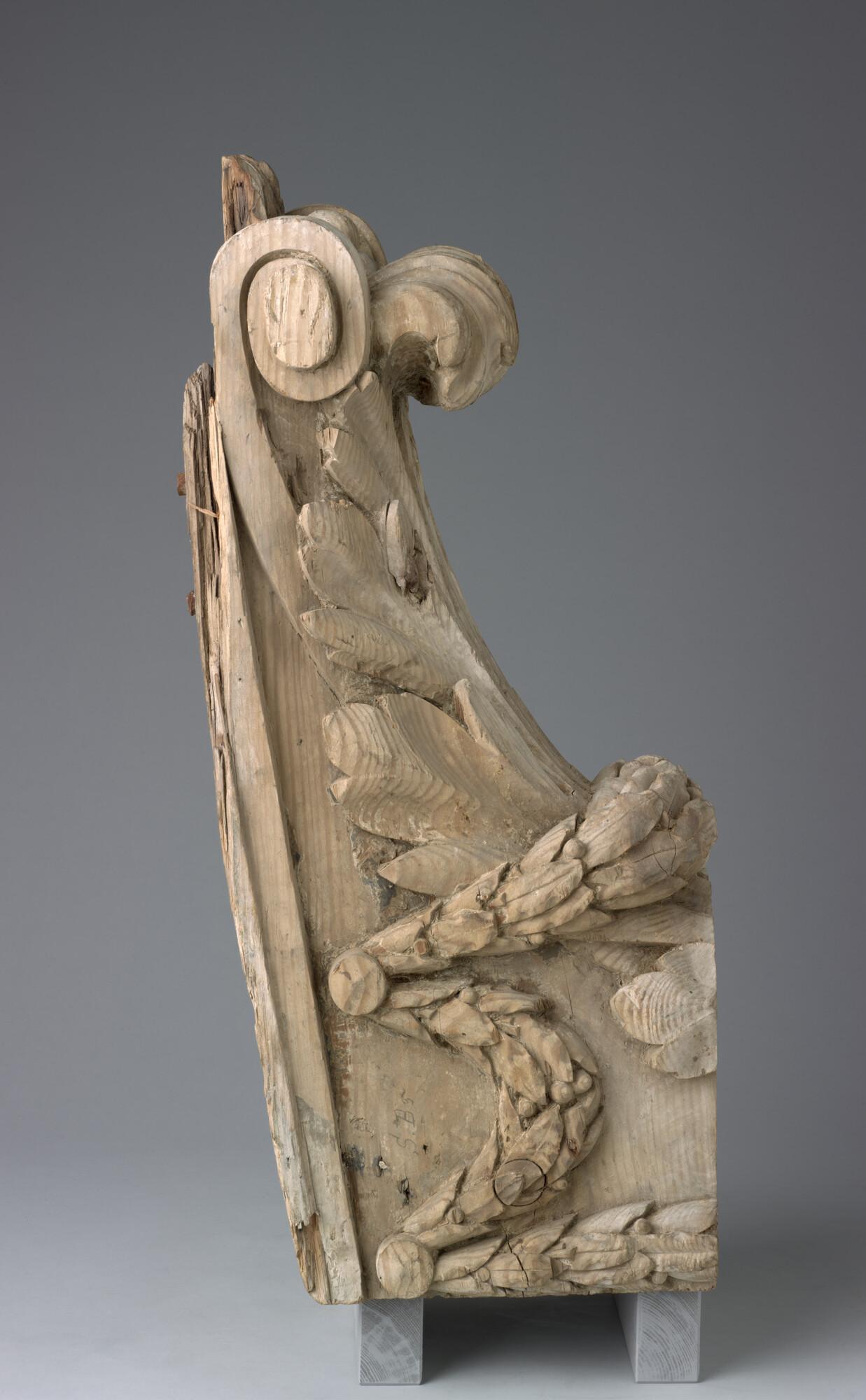 Deel van een console van de spiegelversiering versierd met guirlandes en acanthusblad uitlopend in een krul waarboven een ankerspil is uitgesneden.