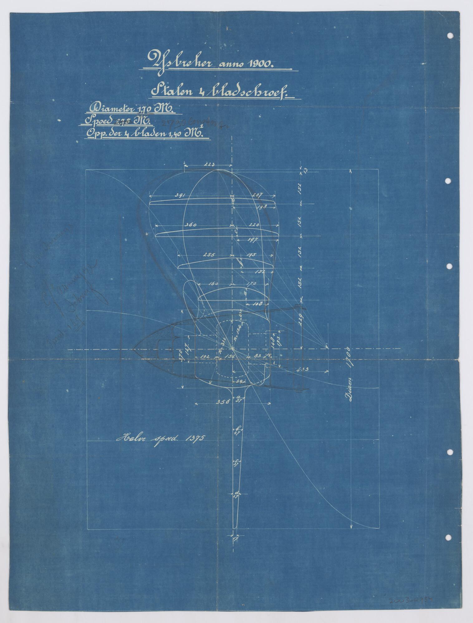 Constructietekening met maten van de stalen 4 bladschroef van de ijsbreker 'Christiaan Brunings'. De schroef heeft een diameter van 1,70 m (schaal 1:20).