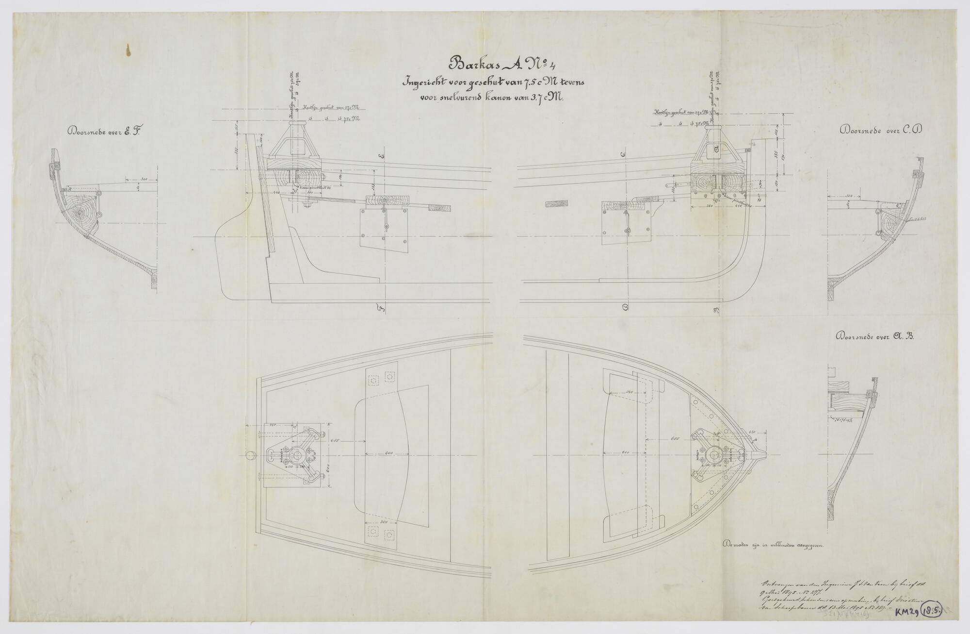 Horizontale en verticale langsdoorsnede en halve dwarsdoorsneden van een houten barkas A4 met op de voorplecht en achterplecht een sloepsaffuit voor een kanon van 7.5 cm of een snelvuurkanon van 3.7cm.