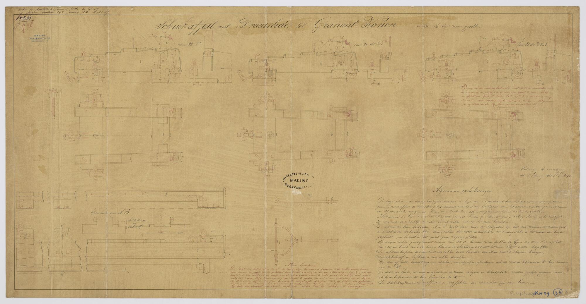 Doorsneden van het schuifaffuit met draaislede tot granaat-kanon met details. Beschrijving (schaal 1:10).