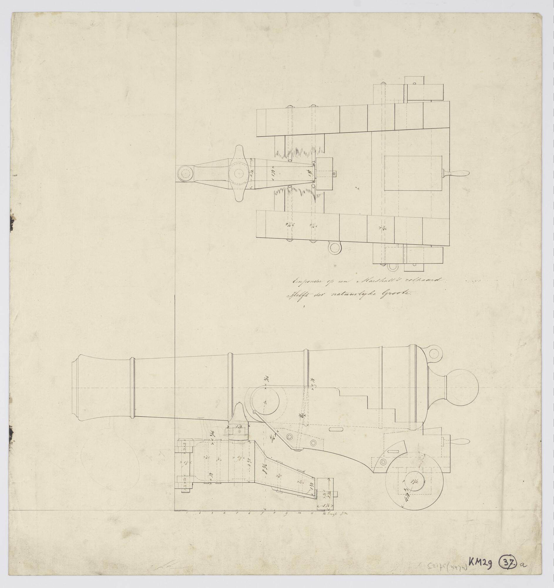 Verticale en horizontale langsdoorsnede van een éénponder kanon op een Marshall's rolpaard (schaal 1:2).