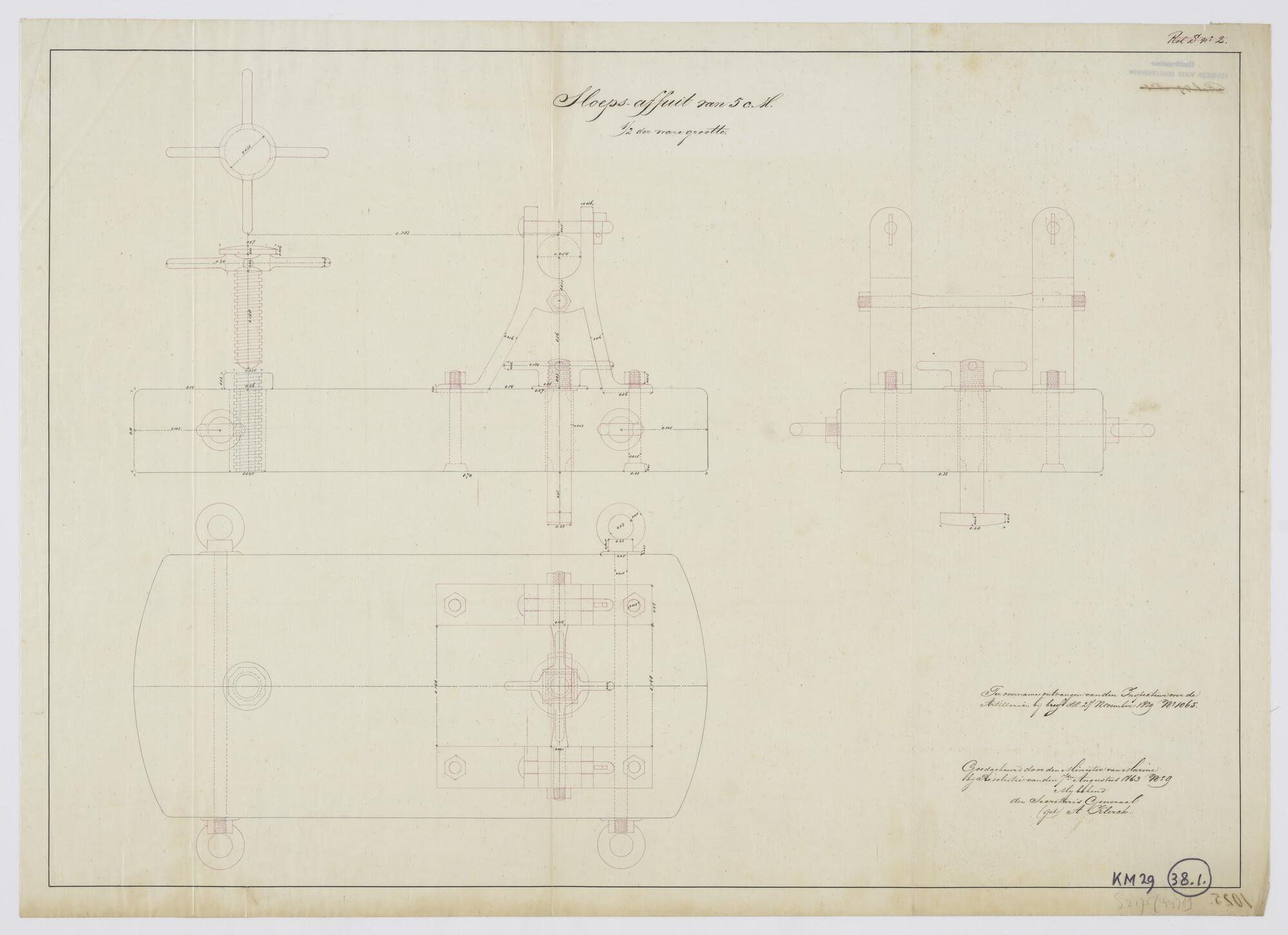 Verticale en horizontale langsdoorsnede en dwarsdoorsnede van een sloepsaffuit tot kanon 5 cm (schaal 1:2).