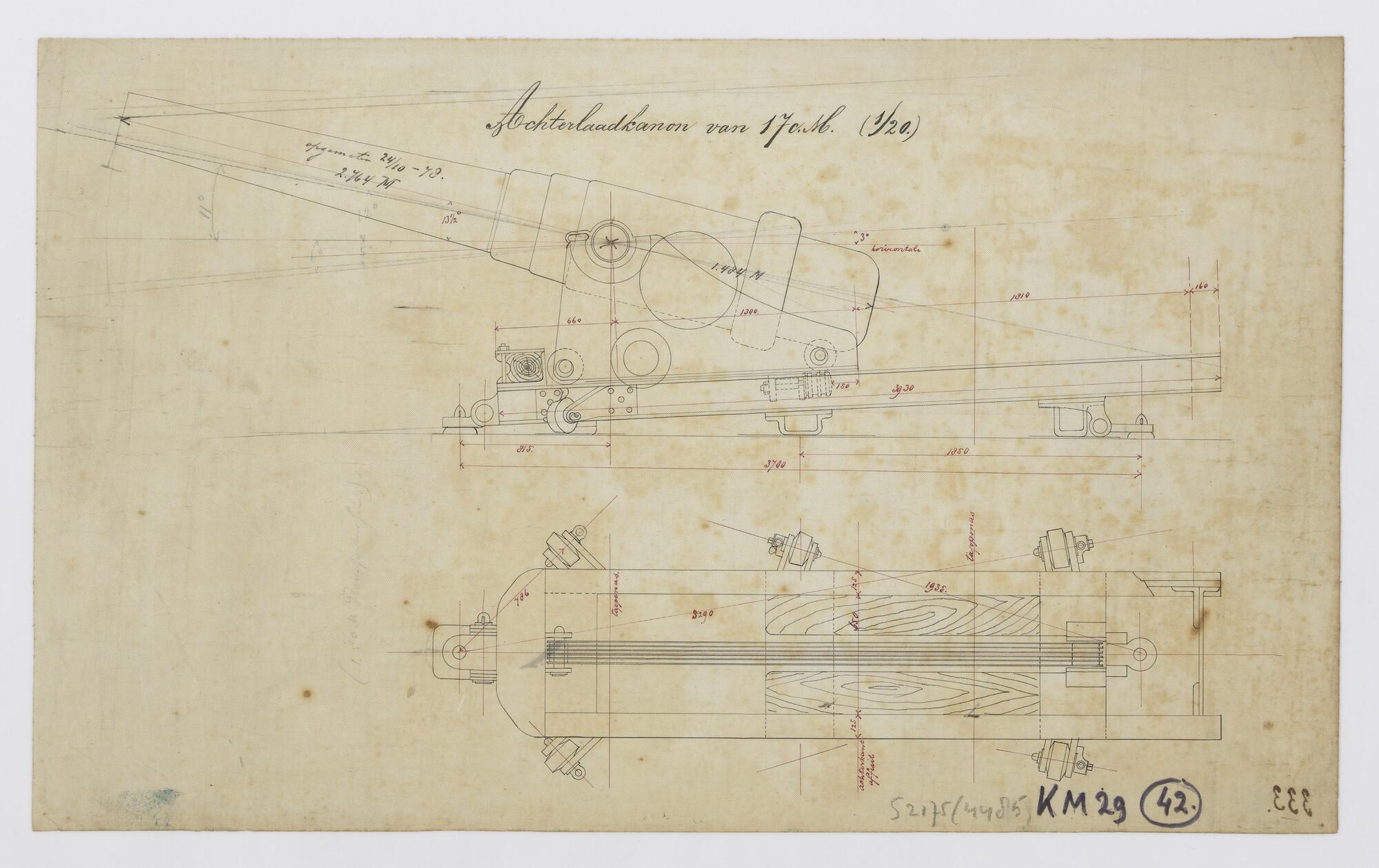 Verticale en horizontale langsdoorsnede van het achterlaadkanon 17 cm (schaal 1:20).