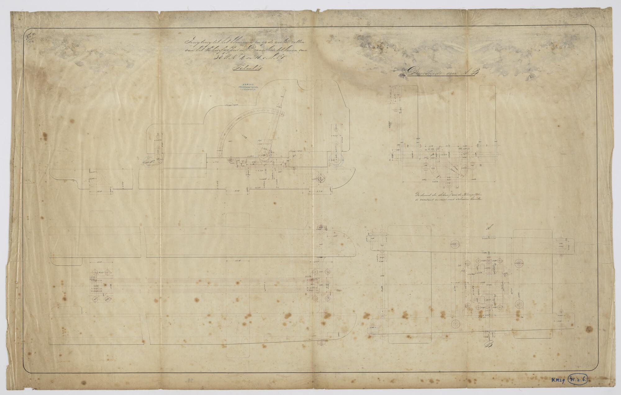 Verticale en horizontale langsdoorsnede en dwarsdoorsneden van de inrichting tot het klemmen en op de wielen zetten van het schuifaffuit en draaislede van het kanon 30 lb no 4 en 16cm no 1 (schaal 1:5).
