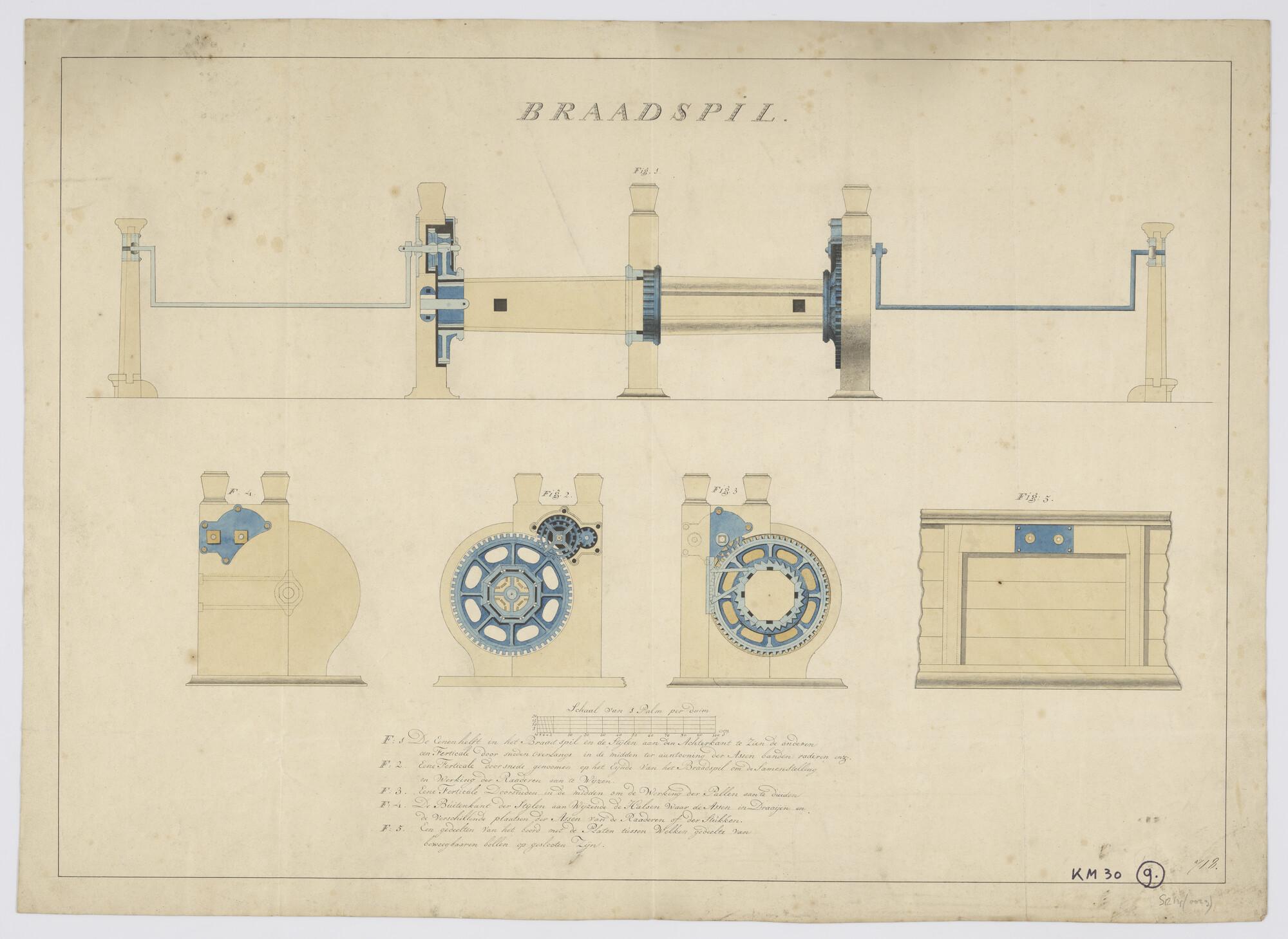 Aanzichten en doorsneden van een ijzeren braadspil (ankerspil) met tandwiellen en palinrichting. Beschrijving (schaal 1 palm per duim).