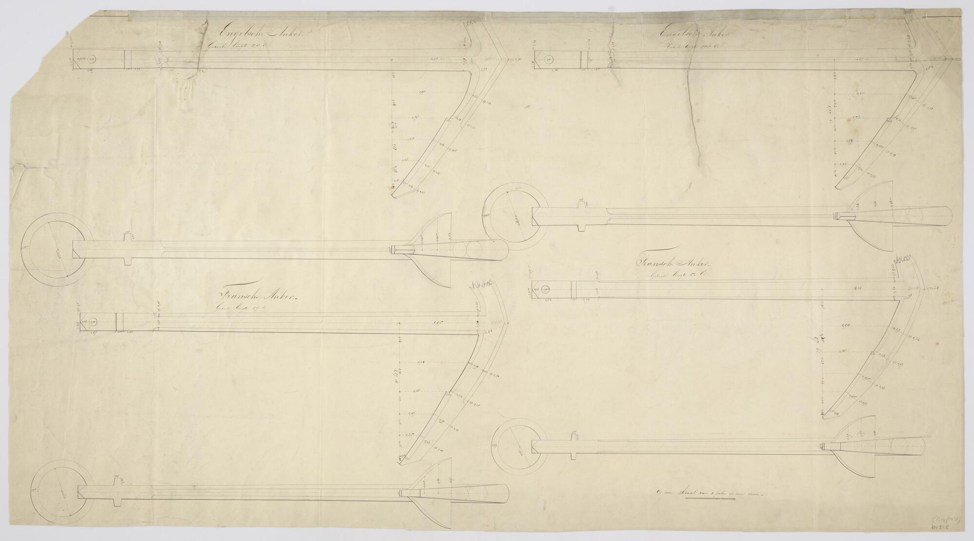 Engels en Frans stokloos anker van verschillende lengte (schaal 1 palm op de duim).