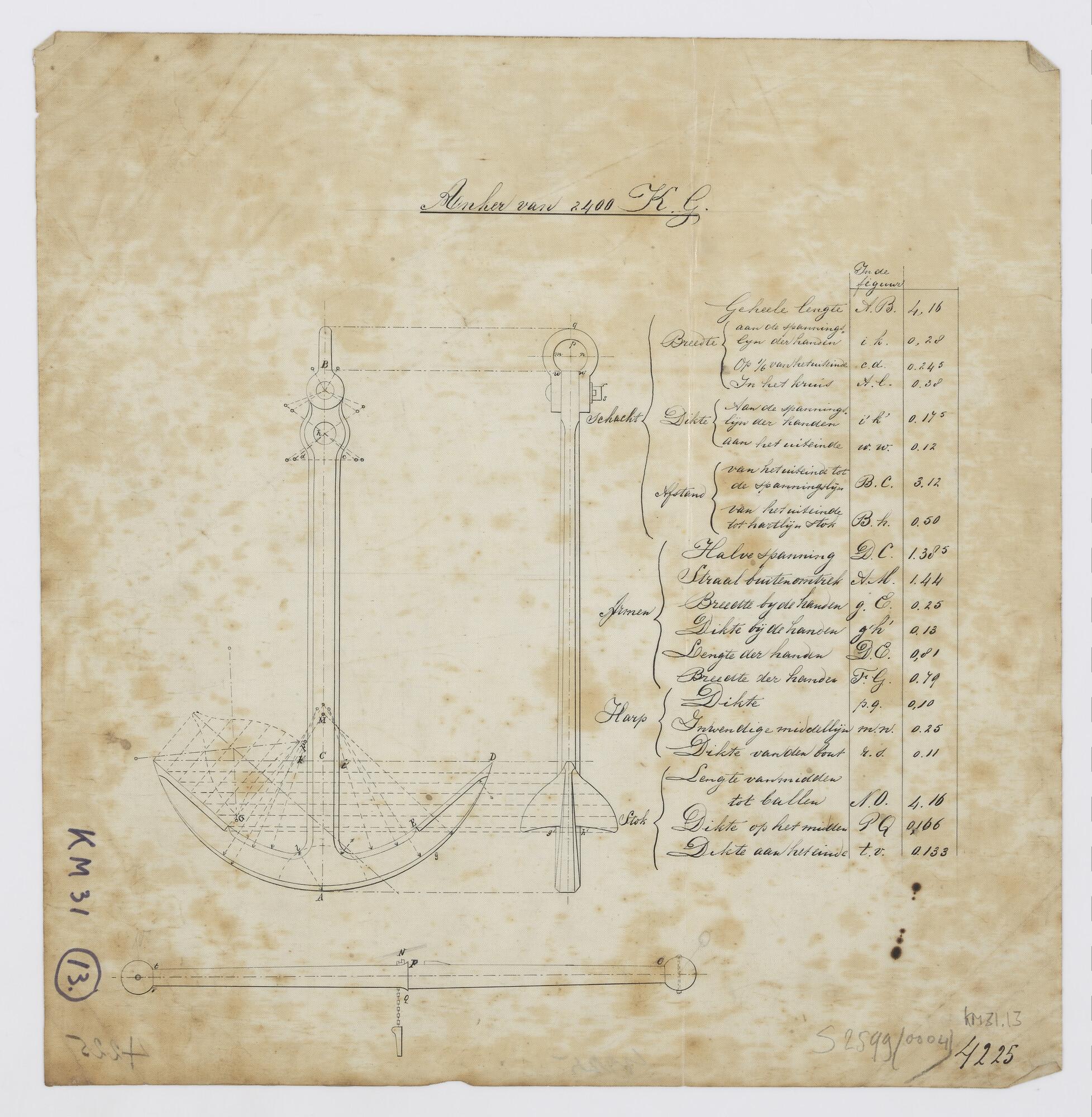 Doorsneden en zijaanzicht van het smeedijzeren anker met stok van 2400 kg. met technische beschrijving.