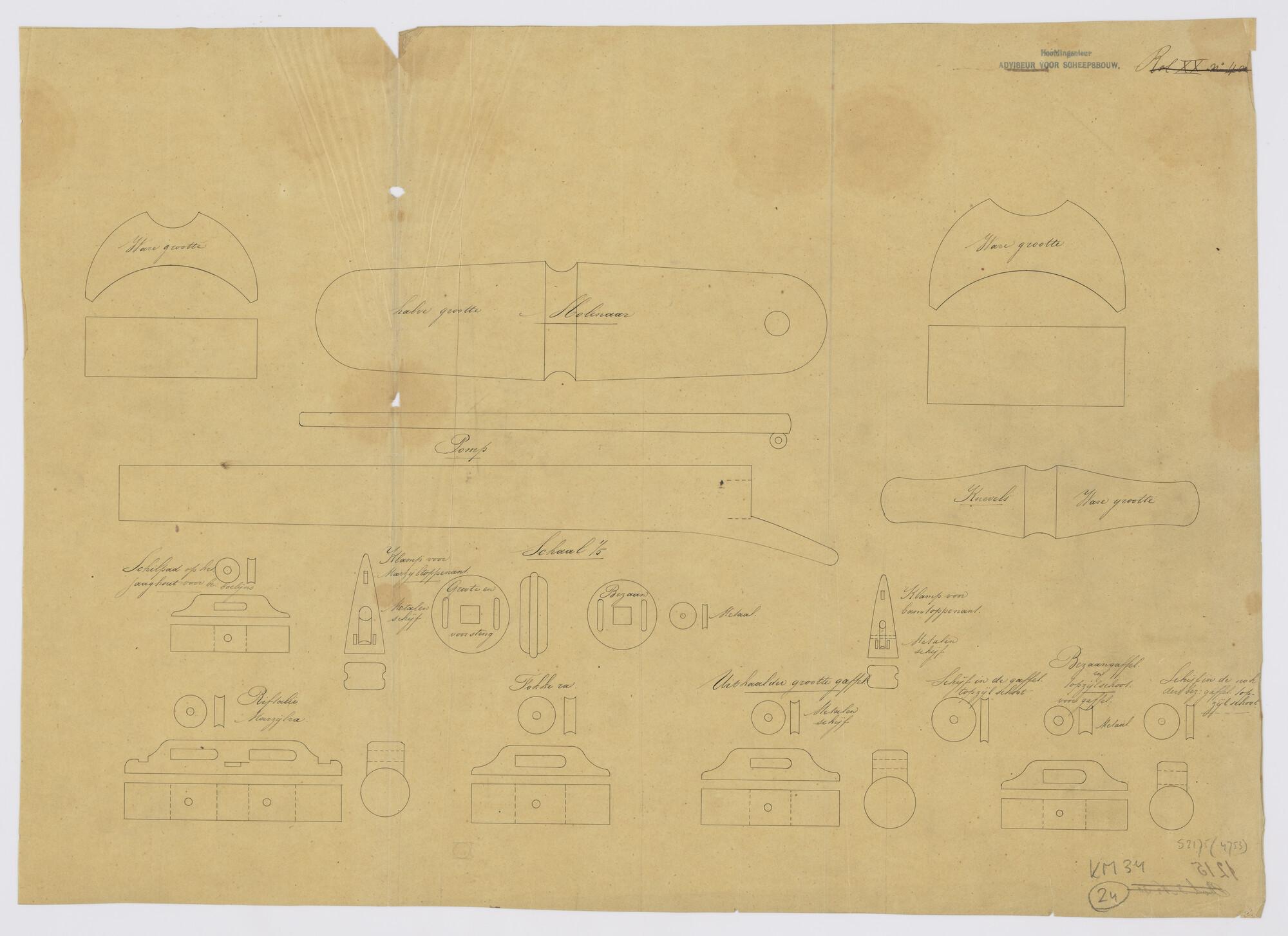 Doornsneden van diverse onderdelen van tuigage van sloepen. Knevels; klampen; schildpad op het jaaghout; riftalie; blokken en schijven etc (schaal 1:5).
