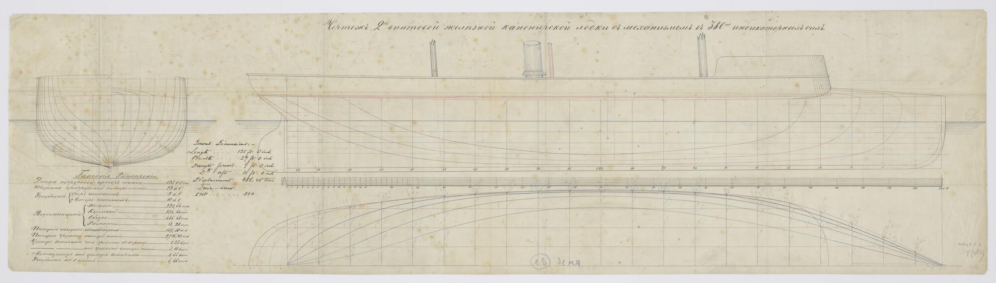 Lijnenplan met spantenraam van een Russische kanonneerboot.Twee masten en één schoorsteen. Afmetingen: 125 x 29 x 9 voet. 456 ton wv.