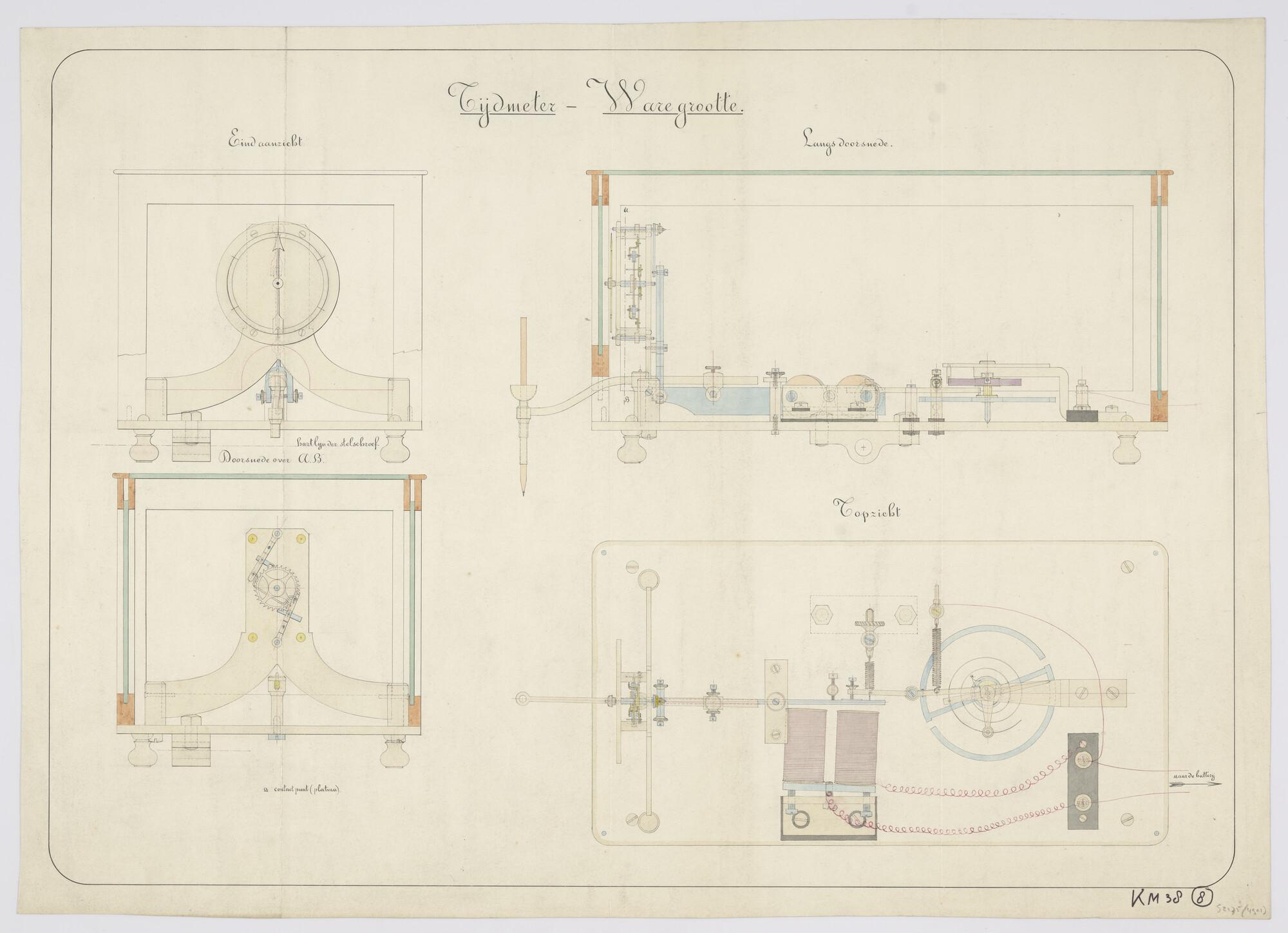 Langsdoorsnede; topzicht; eindaanzicht en dwarsdoorsnede van een electrische tijdmeter met schrijfstift (schaal 1:1).
