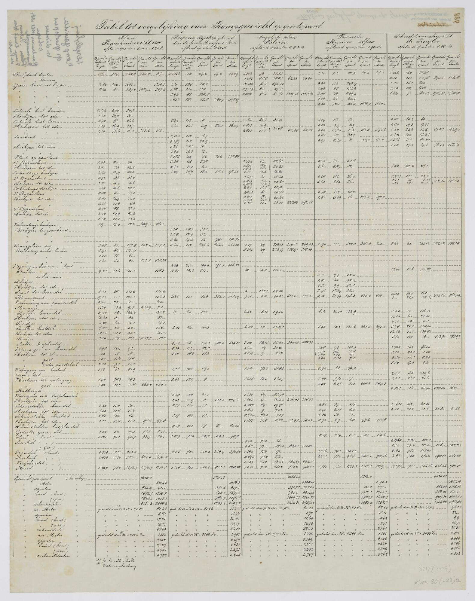 Tabel met vergelijkende rompgewichten op grootspant van het schroefstoomschip der eerste klasse Zr.Ms. 'De Ruijter' met het plan ramkruiser eerste klasse 1884; met het koopvaardijschip gebouwd door de firma Huijgens te Amsterdam; met het plan voor het Engelse koopvaardijschip 'Palmer' (J.Fullerton & Co. Paisly 1884) en met de Franse kruiser 'Sfax' (schaal 1:1).