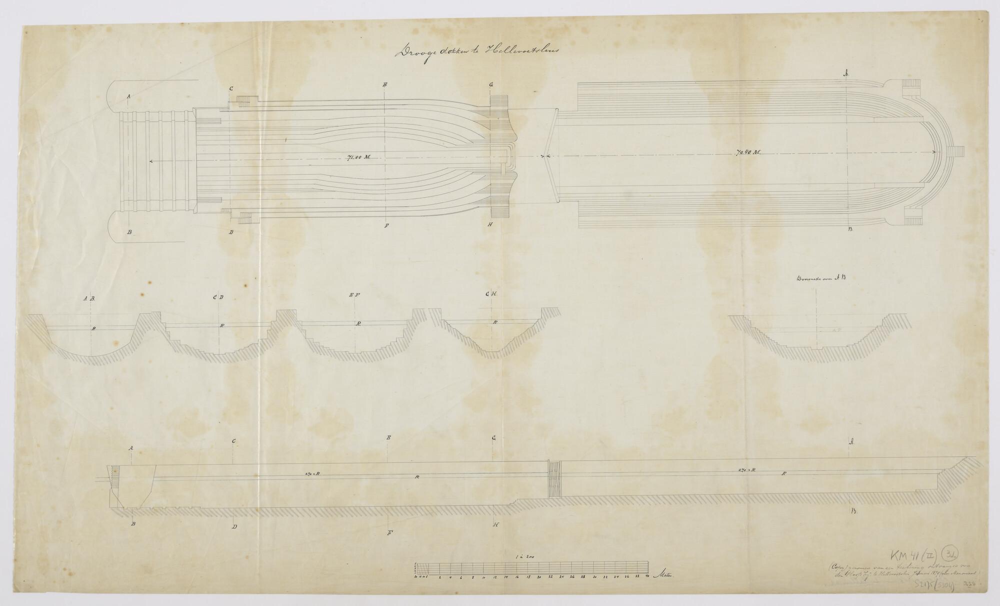 Doorsneden van de droge dokken (Jan BLanken Jansz.) bij de marinewerf te Hellevoetsluis.Horizontale langsdoorsnede; verticale langsdoorsnede en diverse dwars doorsneden. Kieldok met schipdeur (bateau-porte) en timmerdok (schaal 1:500).