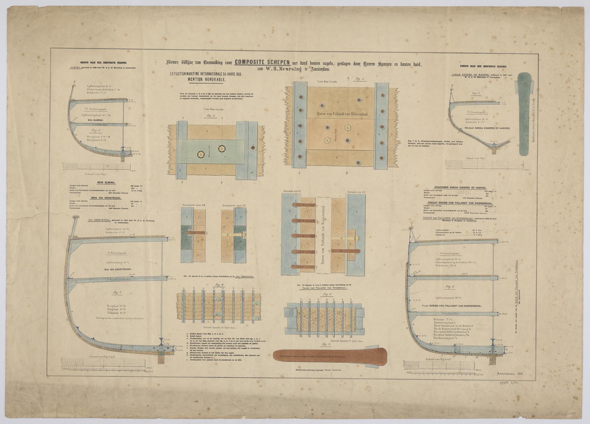 Detailtekening van het vernieuwde composietsysteem van W.H. Meursing aan de hand van grootspanttekeningen van diverse schepen en details van de bevestigingsmethoden van houten huid en ijzeren spanten (schaal 1:1, 1:25).