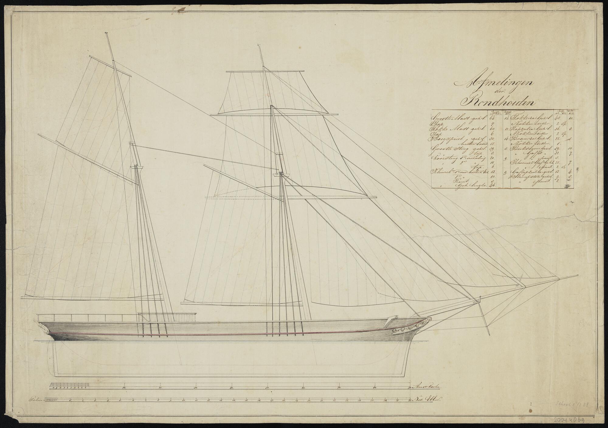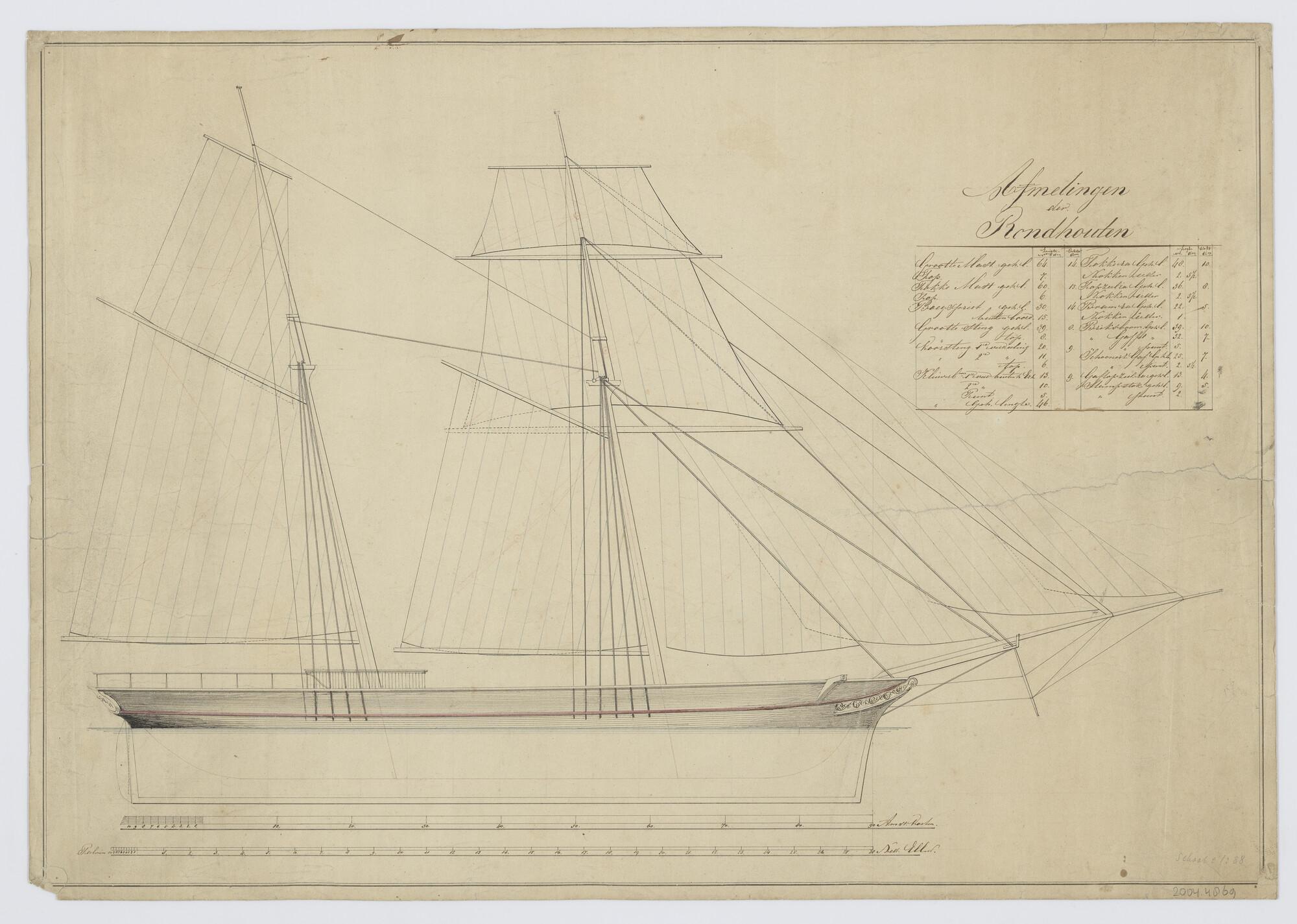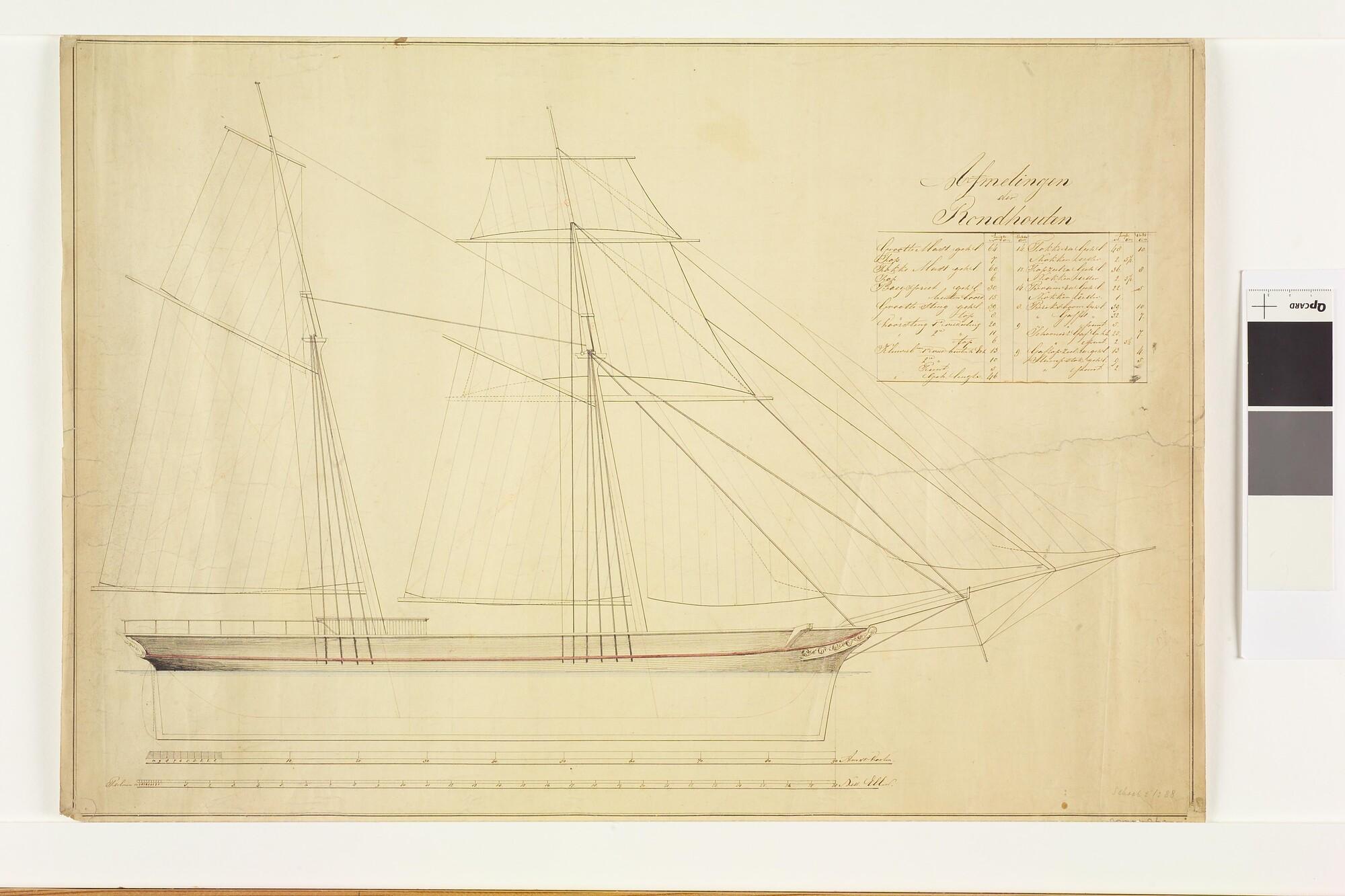 Zijaanzicht tuigage van de topzeilschoener 'Terschelling' met lijst van de afmetingen van de rondhouten. Zeilpunt aangegeven met rood potlood (schaal 1:88).