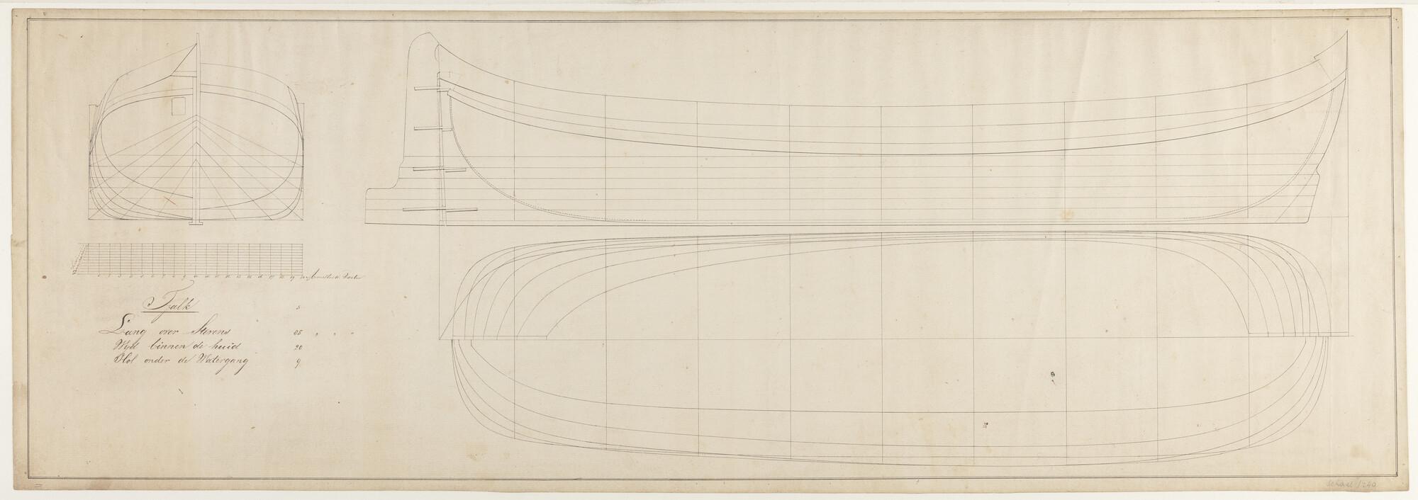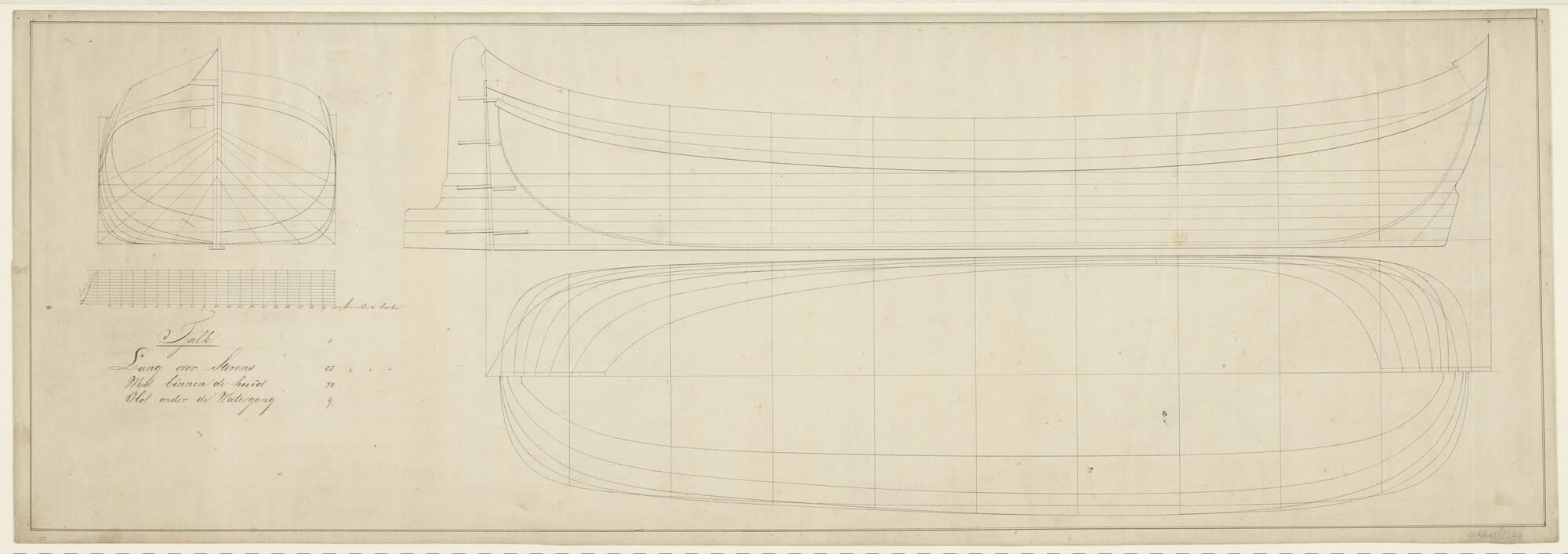 Hektjalk 'Vrouw Anna'. lengte van het schip 85 Amsterdamse voeten, wijd binnen de huid 20 en holte onder de watergang 9 Amsterdamse voeten (schaal 1:40).