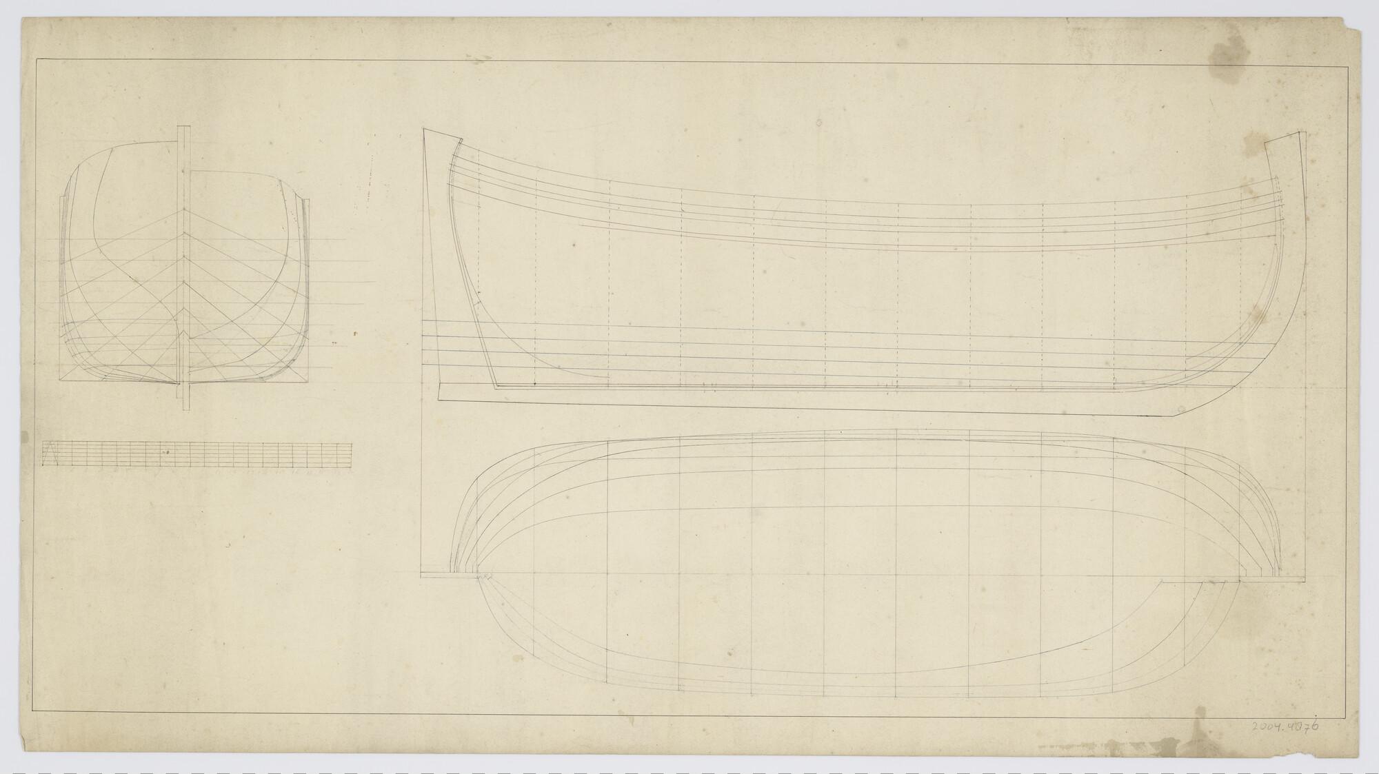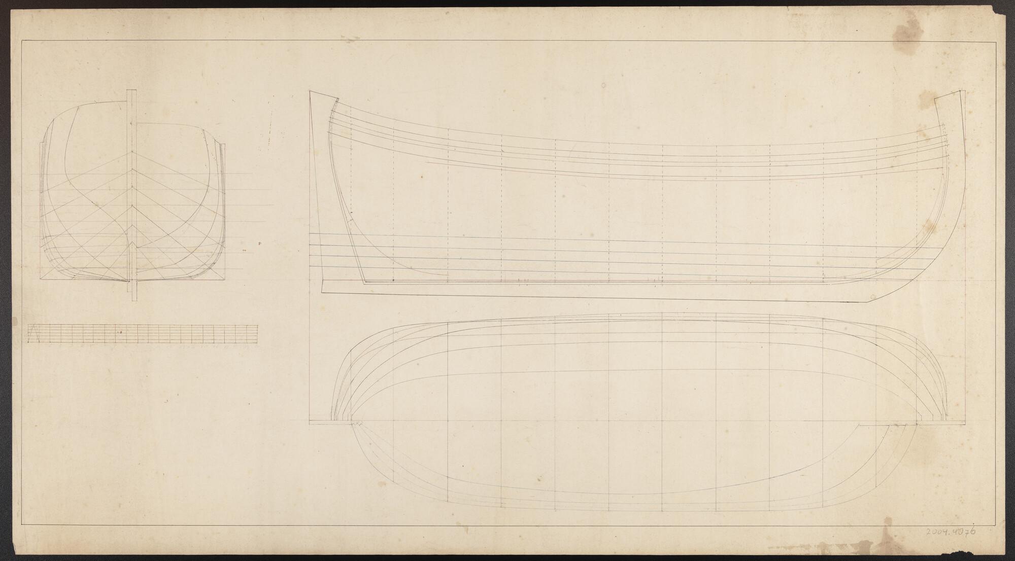 Spantenraam, voor- en zijaanzicht, bovenaanzicht en langsdoorsnede van een hoeker.