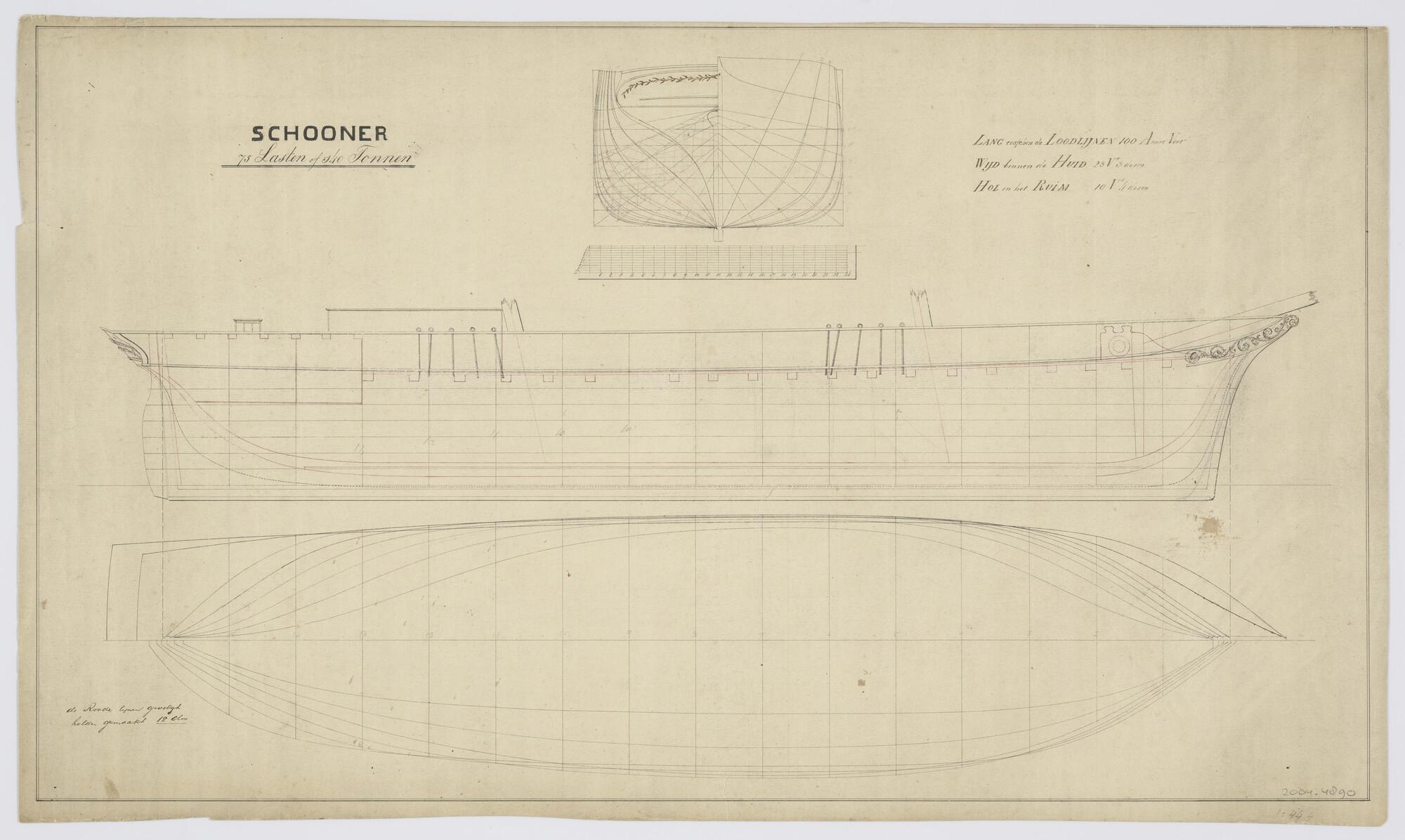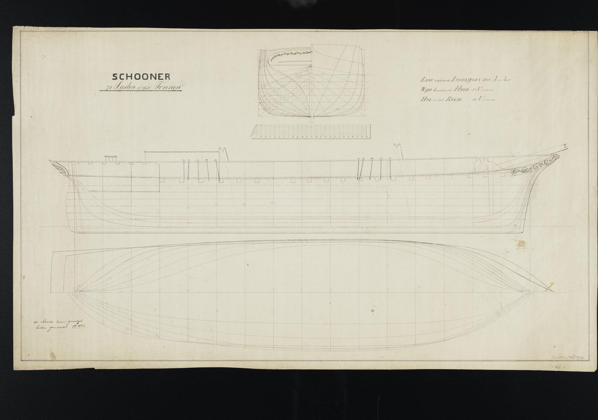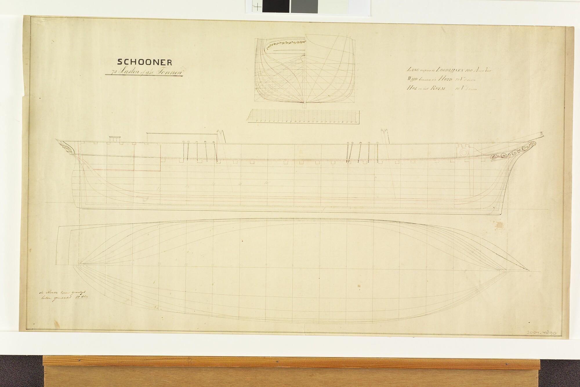 Spantenraam, voor- en achteraanzicht, bovenaanzicht en langsdoorsnede van de schoener 'Terschelling' van 75 lasten of 140 tonnen. Lengte tussen de loodlijnen 100 Amsterdamse voet, wijdte binnen de huid 23,3 voet, hol in het ruim 10,4 voet (schaal 1:44,4).