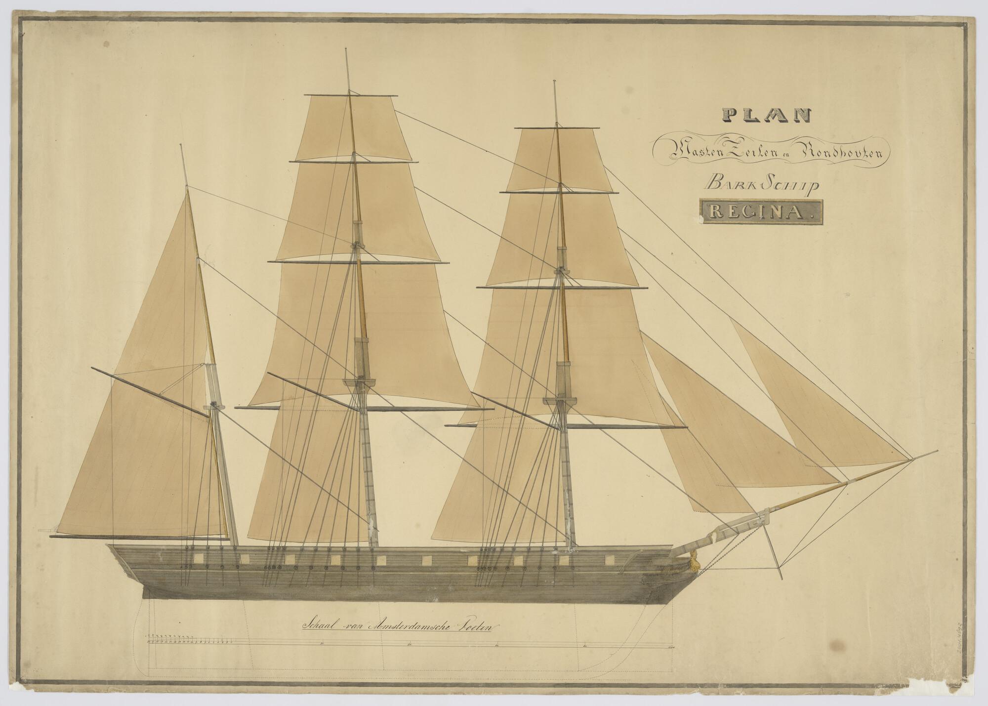 Plan van masten, zeilen en rondhouten van de bark 'Regina'.