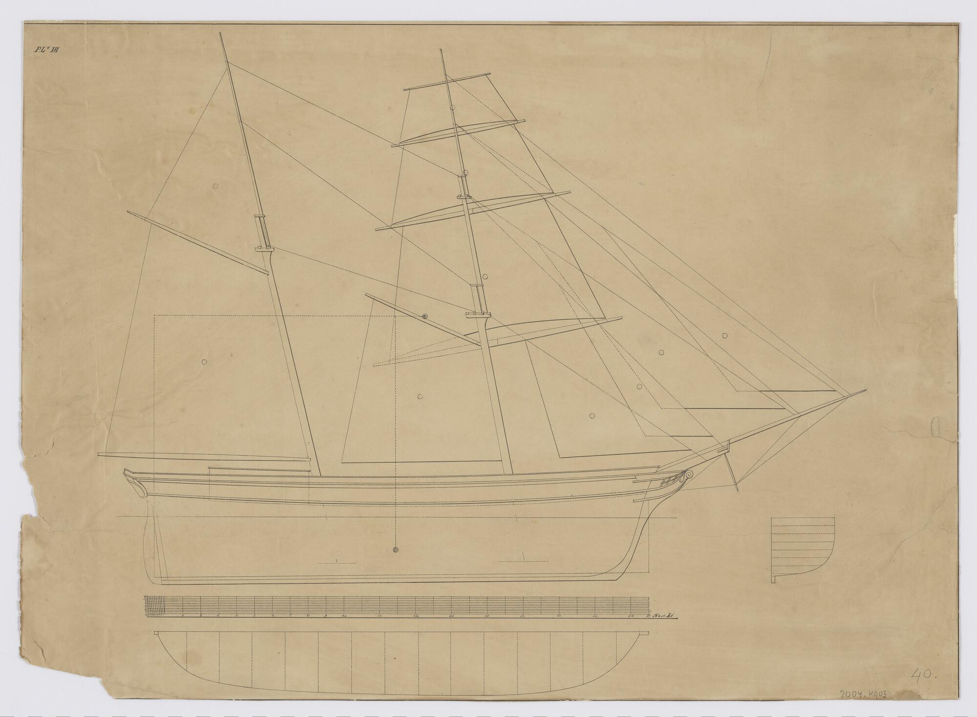 Zijaanzicht van romp en tuigage van een tweemast topzeilschoener.
