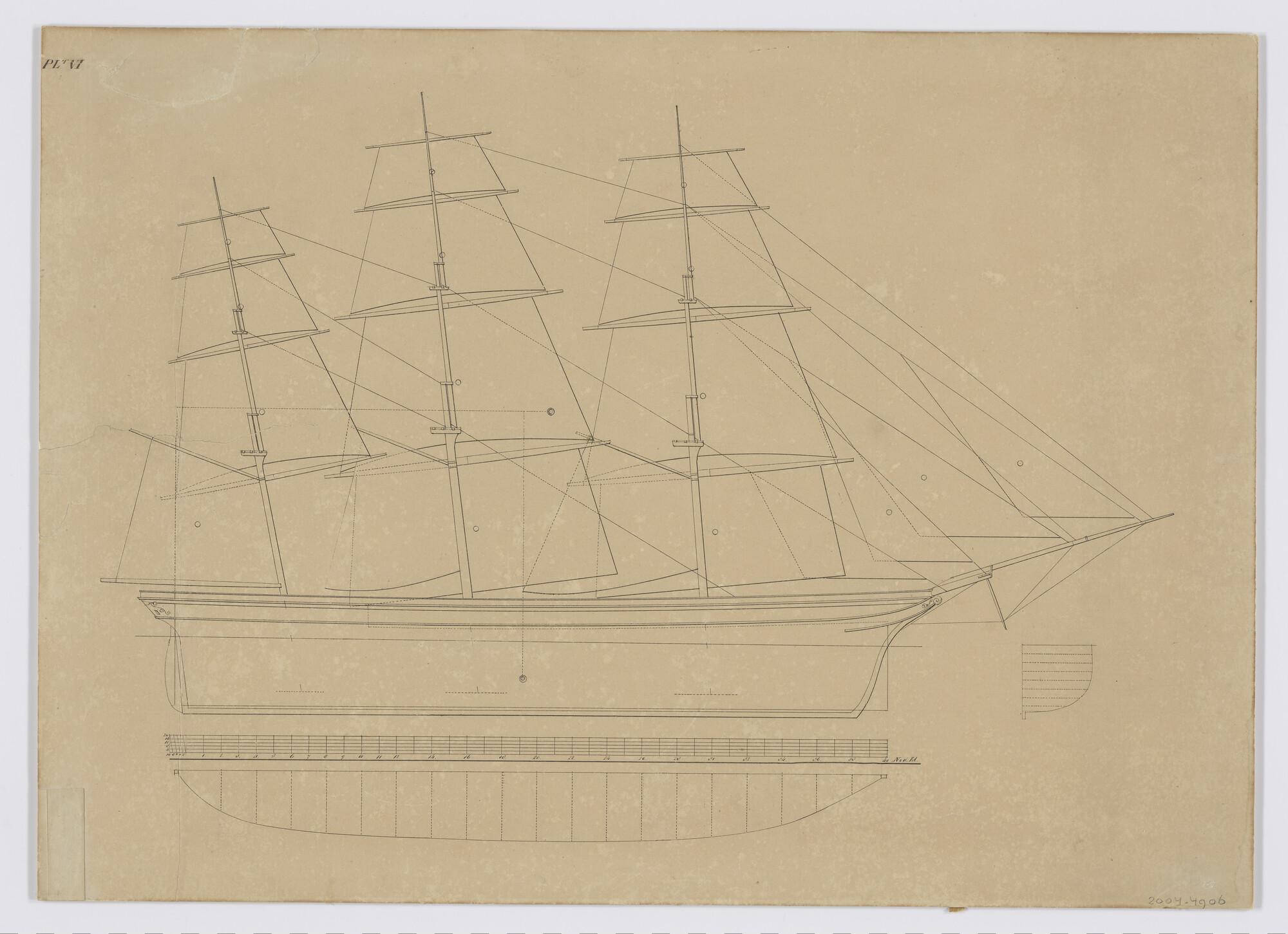 Zijaanzicht romp en driemasttuigage van een clipper.