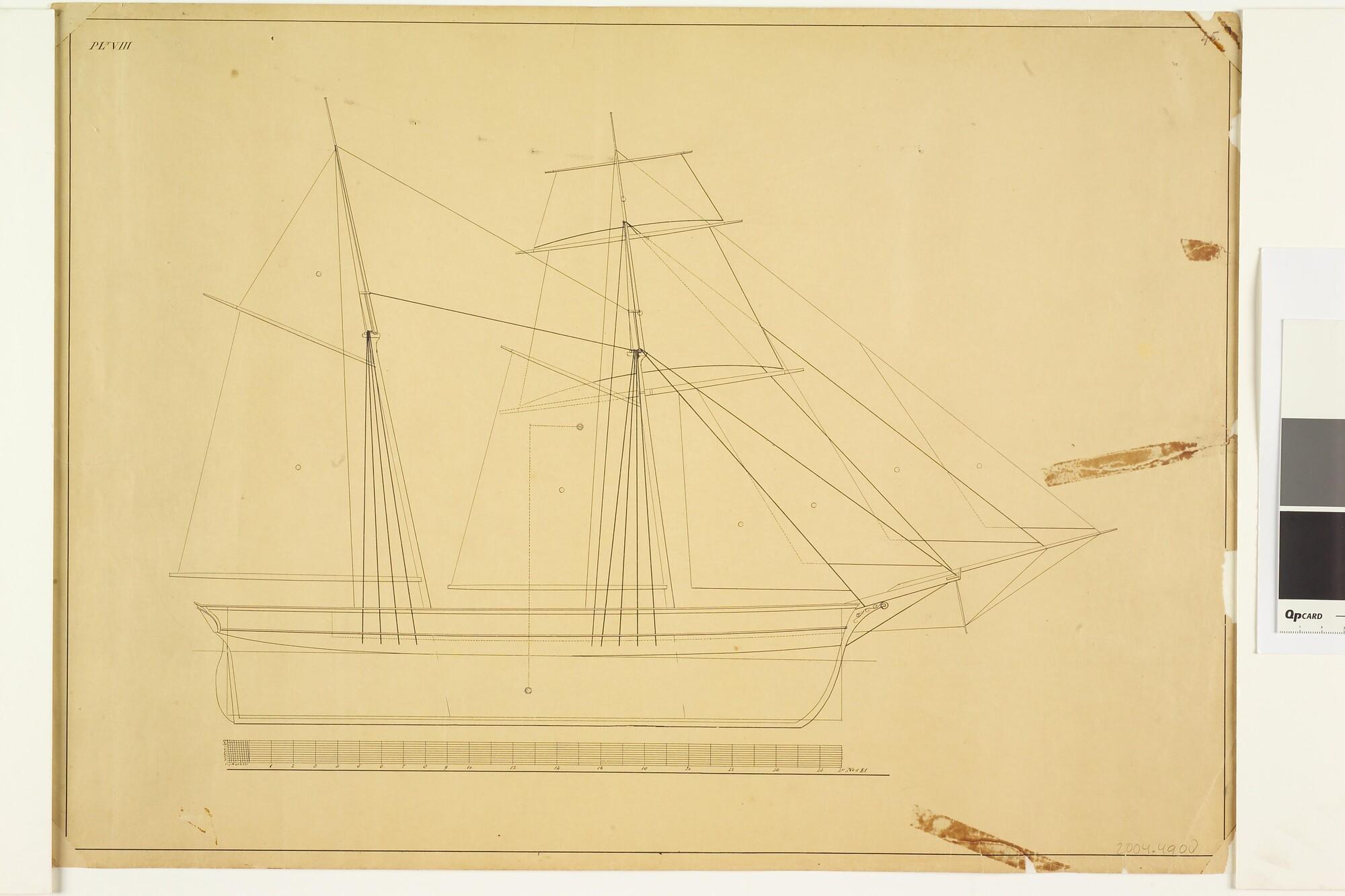 Zijaanzicht van romp en tuigage van een tweemast schoener.
