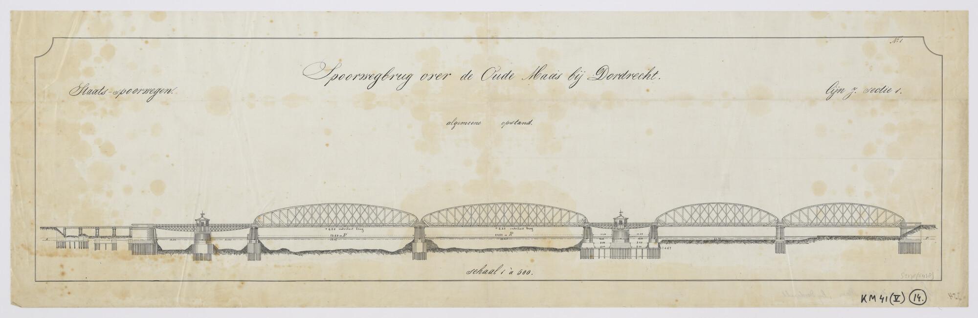 Aanzicht van de spoorbrug over de Oude Maas te Dordrecht. Fundatie der pijlers. Breedte der vier doorvaartopeningen. Vier overspanningen (schaal 1:500).