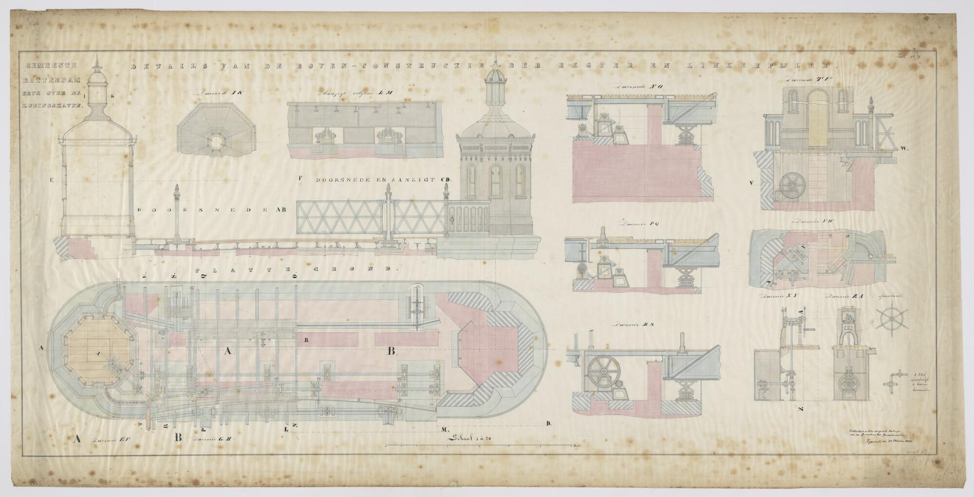 Plattegrond, doorsneden en aanzichten van de brug over de Koningshaven te Rotterdam. Details van de boven constructie der rechter en linker pijler (schaal 1:20).