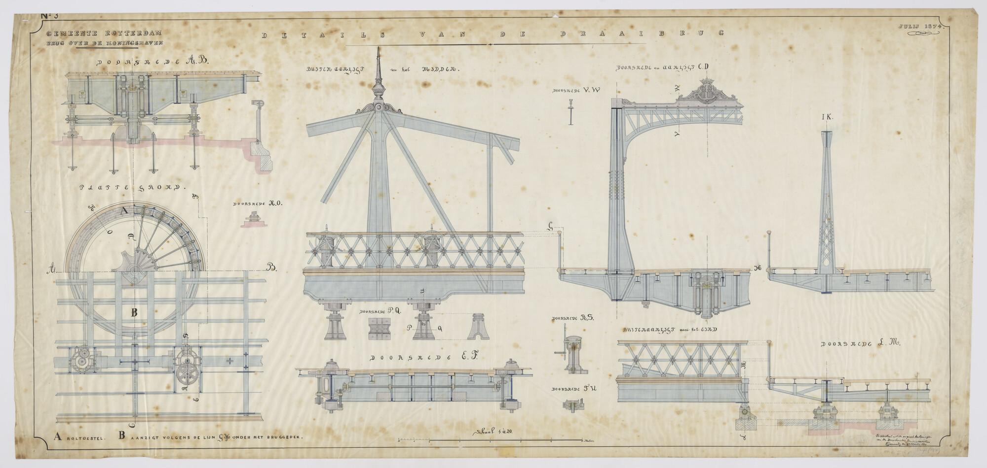 Plattegrond, doorsneden en aanzichten van details van de brug over de Koningshaven te Rotterdam. Roltoestel (schaal 1:20).