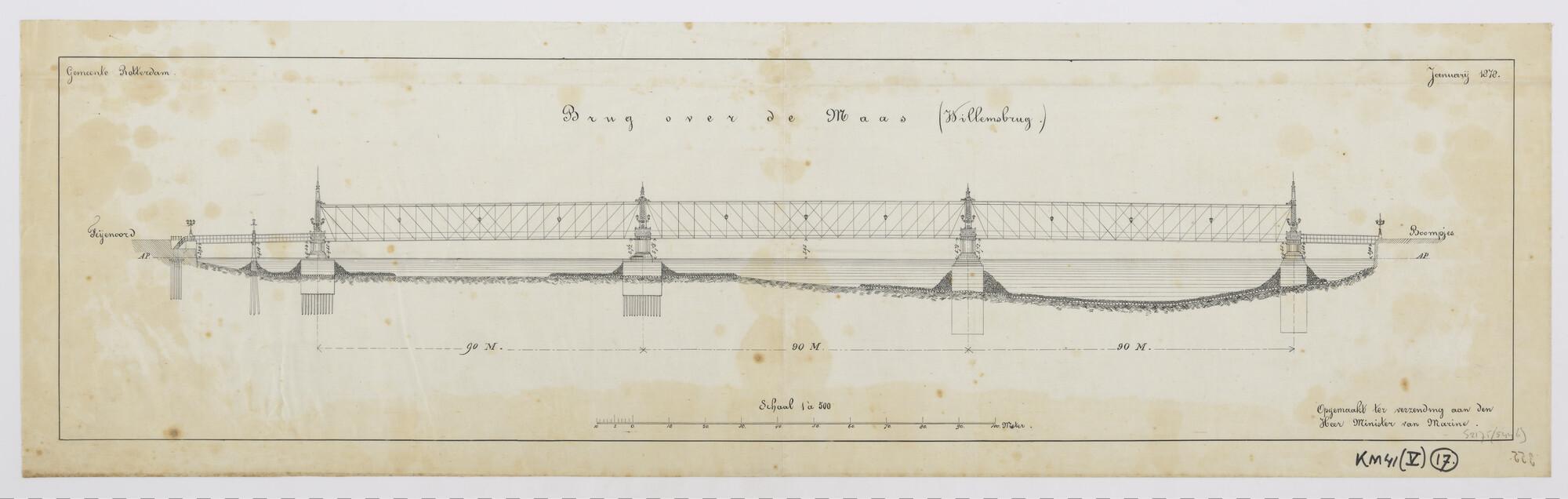 Zijaanzicht over de Willemsbrug over de Maas te Rotterdam tussen de Boompjes en Feijenoord. Twee vaste bruggen en drie vaste overspanningen. Profiel van de Maas ter plaatse (schaal 1:500).