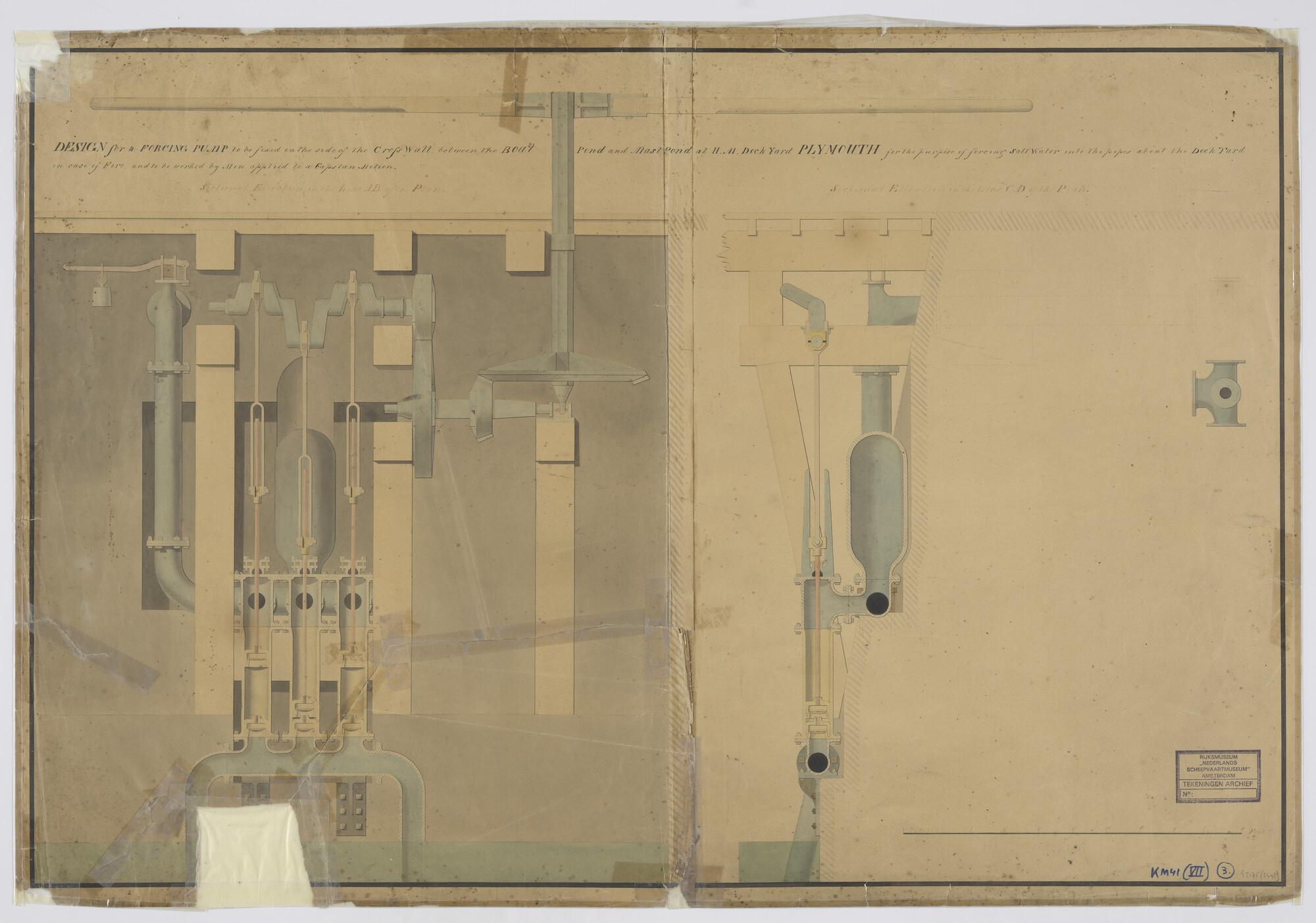 Doorsnede van een zoutwater brandbluspomp, handbediend als een kaapstander met tandwieloverbrenging, in gebruik bij H.M. Dockyard Plymouth (schaal in feet).